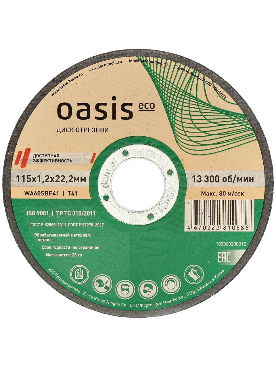 Oasis Eco d115х1,2 мм с зернистостью P60 оптимален для тонкого и среднего металла, обеспечивает чистый срез и минимальный нагрев.