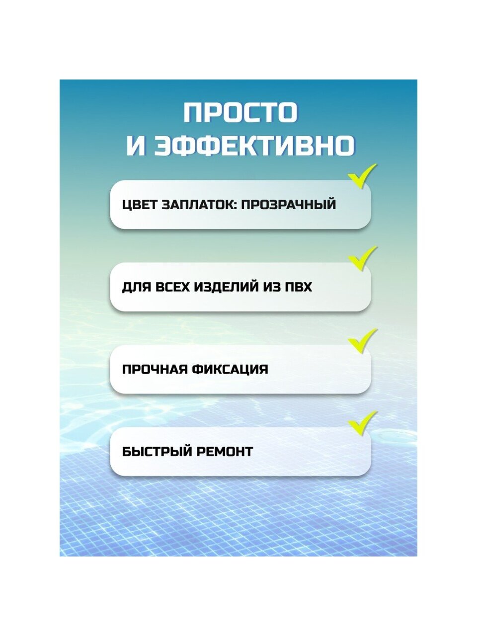 - Универсальность: подходит для всех типов надувных ПВХ изделий, обеспечивая надежный ремонт.