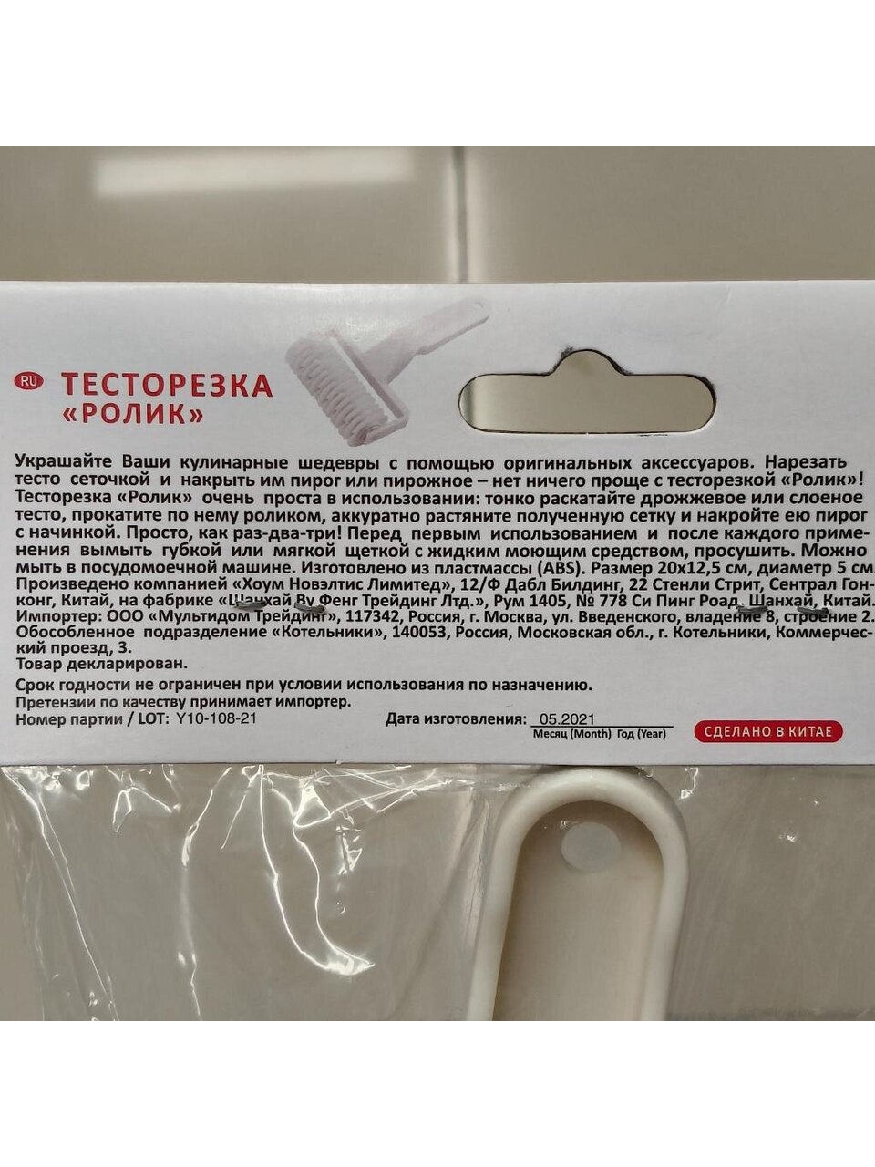Для любителей домашних пирогов тесторезка «Ролик» станет незаменимым приспособлением. Аксессуар прост в использовании: тонко раскатайте дрожжевое или слоеное тесто, аккуратно прокатите роликом, растяните полученную сетку и накройте ею пирог с начинкой. С этой задачей справится даже новичок! Используйте тесторезку для сладких, овощных или мясных пирогов — на любом изделии сеточка из теста будет смотреться аппетитно. После использования промойте в проточной воде с жидкими моющими средствами. Хранить изделие можно в шкафчике или на крючке, для этого на ручке предусмотрено отверстие. Размер 20х12,5 см, диаметр 5 см. Изготовлено из пластмассы (ABS).