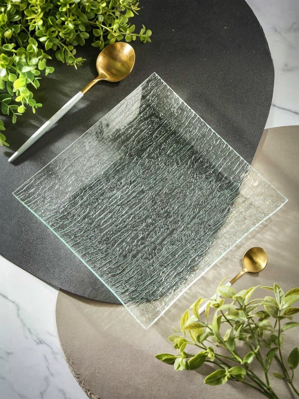 Стильное квадратное стеклянное блюдо 25х25 см «Лед полосы» — универсальное решение для сервировки закусок, сыра и нарезки, подходит для дома и дачи.