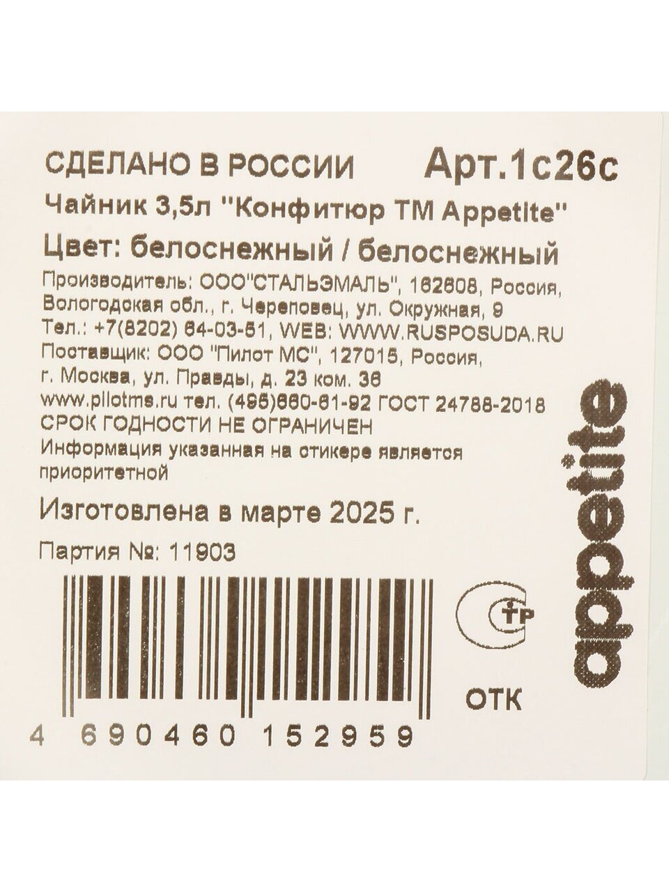 Вы можете приобрести «Чайник сталь, эмалированное покрытие, 3.5 л, ручка металл, Appetite, Конфитюр, индукция, 1с26с» и другие товары в нашем интернет-магазине в Смоленске по низким ценам и с бесплатным самовывозом.