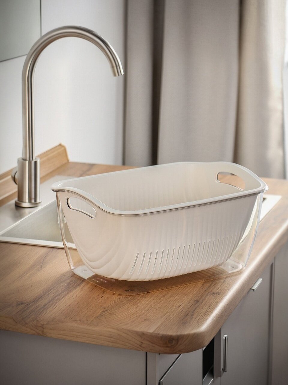 Размер 33×23×16 см: оптимально для промывания овощей, фруктов, макарон, круп. Подходит для домашнего и дачного использования.
