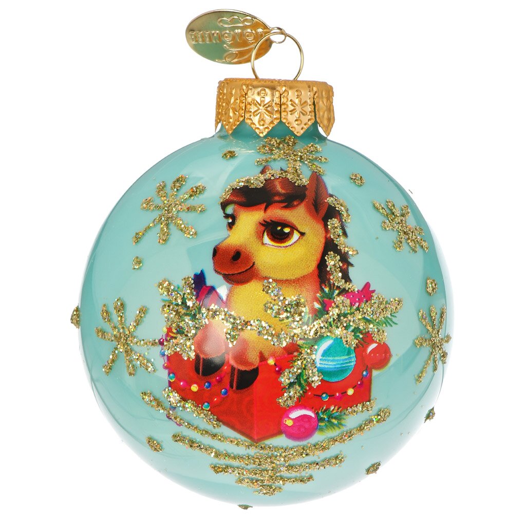 Елочный шар Лошадка новогодняя 6.5 см — стильный стеклянный декор с ручной росписью. Подарите уют, символ года 2026 и нежный голубой акцент вашему интерьеру.