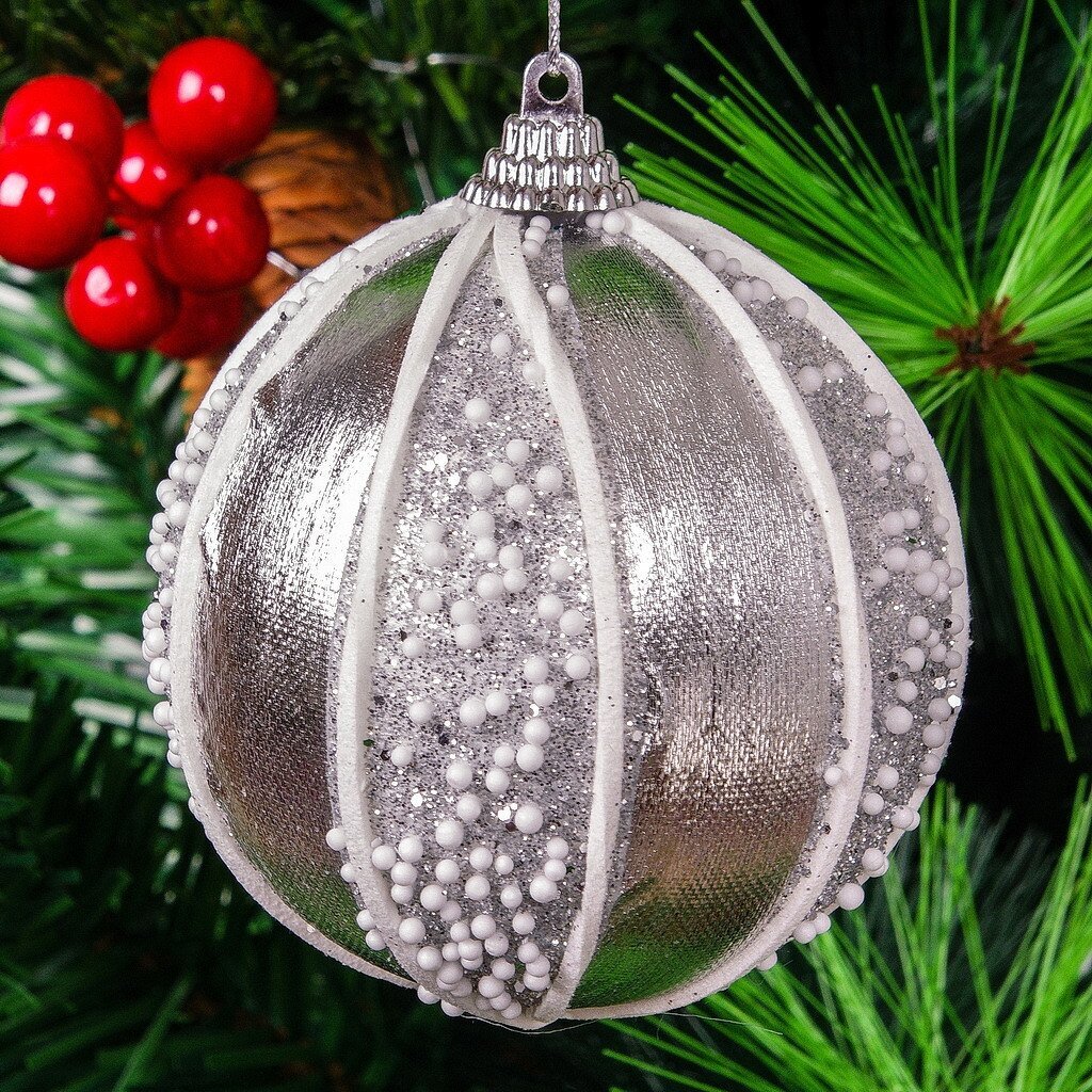 - Средний диаметр 8 см: оптимален для классических и компактных ёлок, выполнен из прочного полиэстера, устойчив к ударам и выцветанию