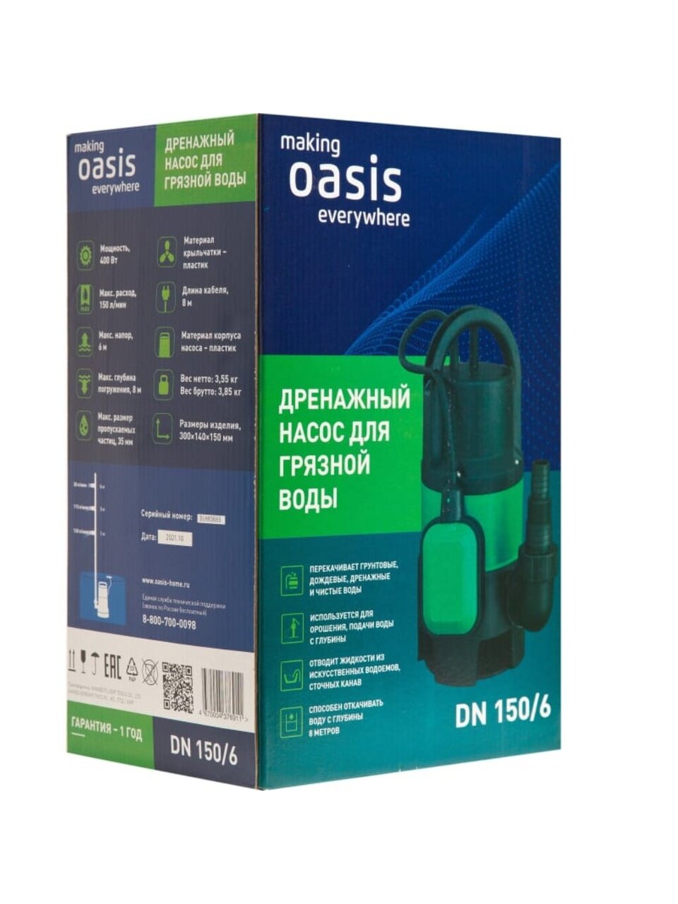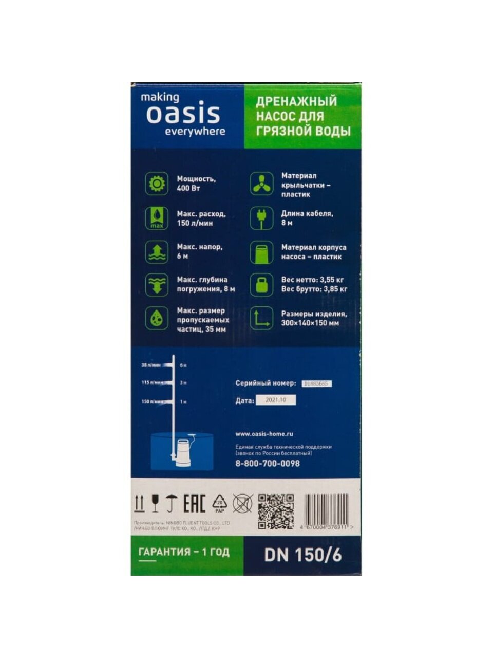 Вы можете приобрести «Насос фекальный, Oasis, 400 Вт, глубина погружения 8 м, максимальный напор 6 м, 9 м³/ч, 150/6» и другие товары в нашем интернет-магазине в Смоленске по низким ценам и с бесплатным самовывозом.