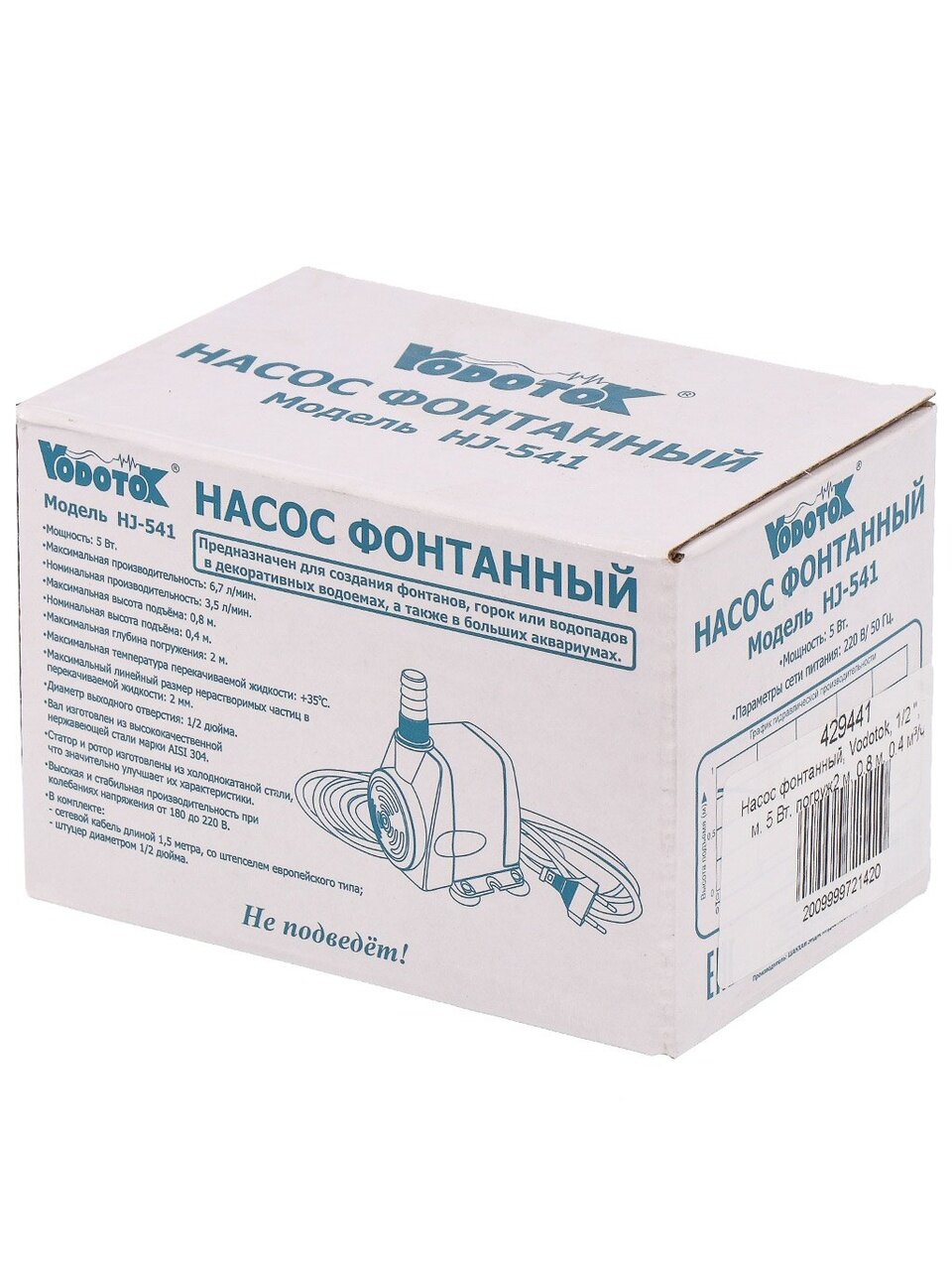 Вы можете приобрести «Насос фонтанный, Vodotok, 1/2 '', 1.5 м, 5 Вт, глубина погружения 2 м, 0.8 м, 0.4 м³/ч, HJ-541» и другие товары в нашем интернет-магазине в Белгороде по низким ценам и с бесплатным самовывозом.