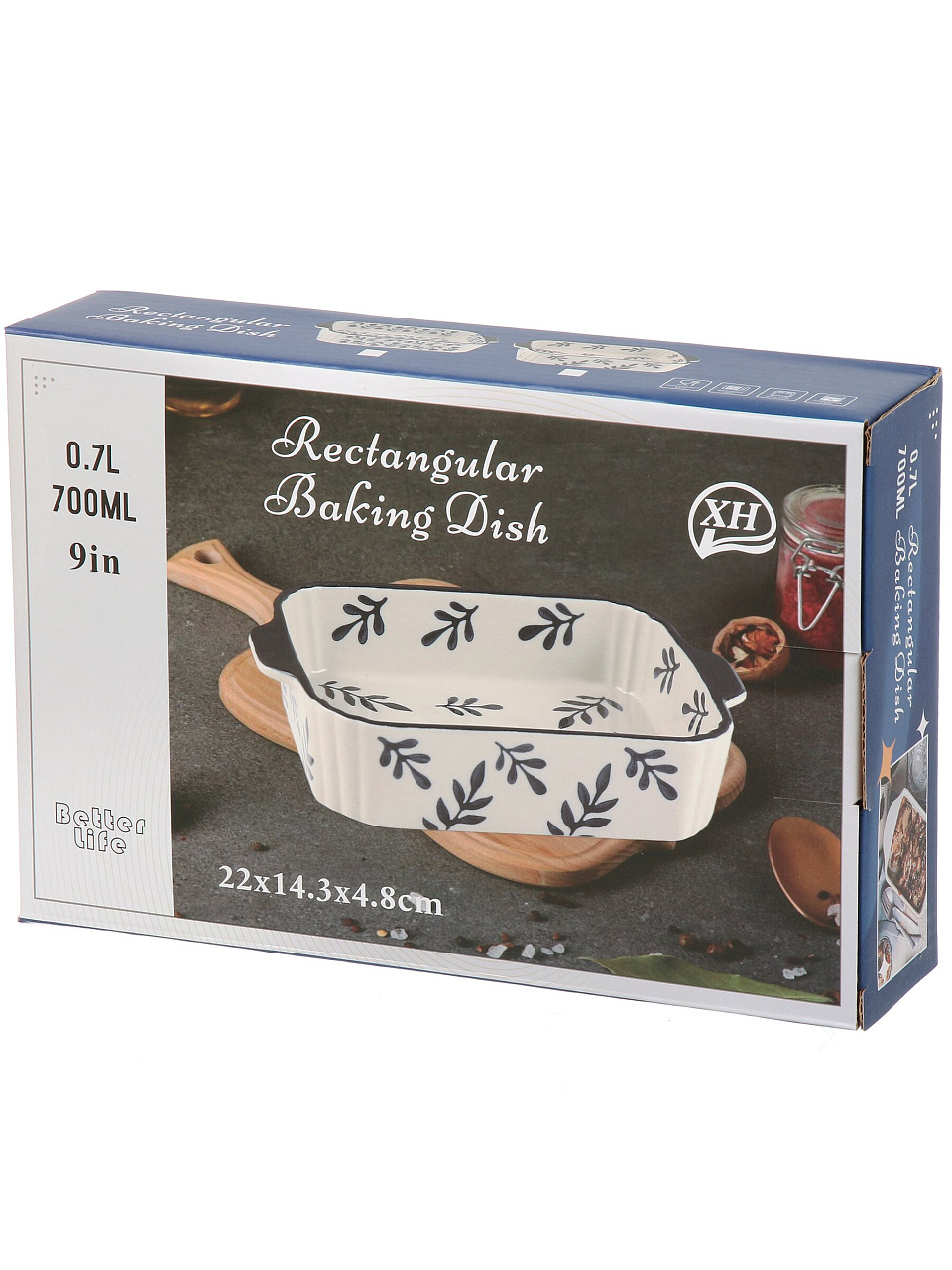 Размер формы — 21,5х14х5 см, объем 0,7 л. Подходит для запекания пирогов, курицы, рыбы, мяса, а также овощей и десертов.