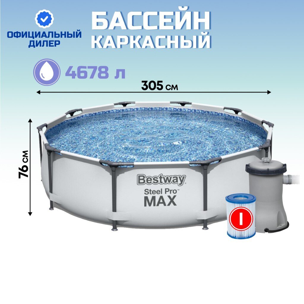 Вы можете приобрести «Бассейн каркасный Bestway, 305х76 см, Steel Pro Max, 56408, фильтр-насос, 4678 л» и другие товары в нашем интернет-магазине в Тамбове по низким ценам и с бесплатным самовывозом.