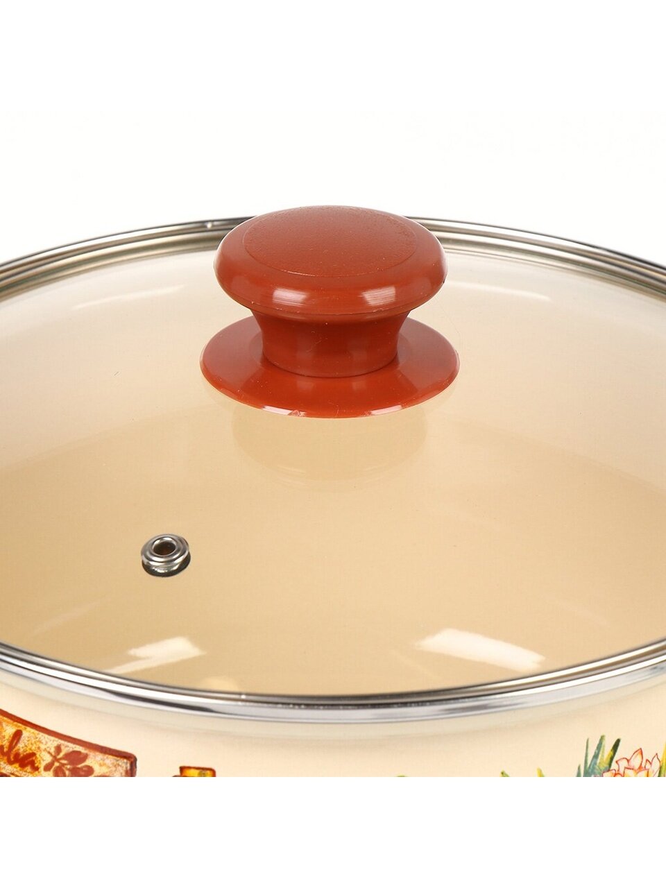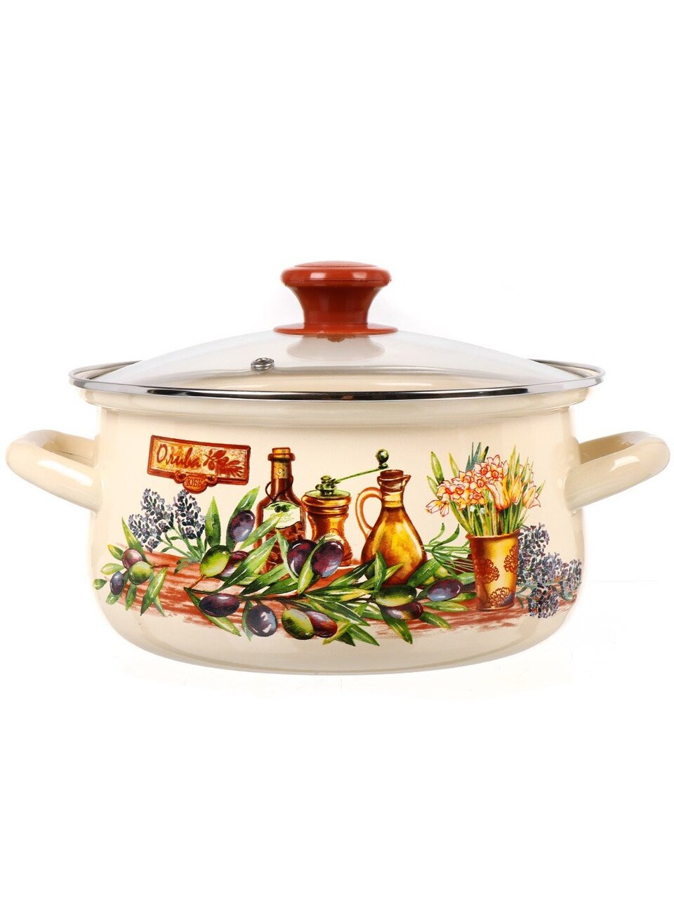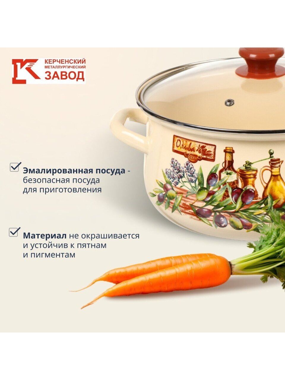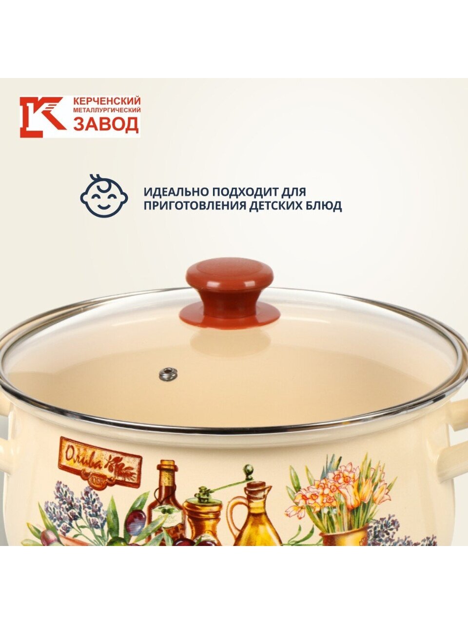 Кастрюля эмалированная 4 л с декором и стеклянной крышкой от Керченского металлургического завода — оптимальный выбор для дома и дачи: не впитывает запахи, легко моется, подходит для супов и каш.