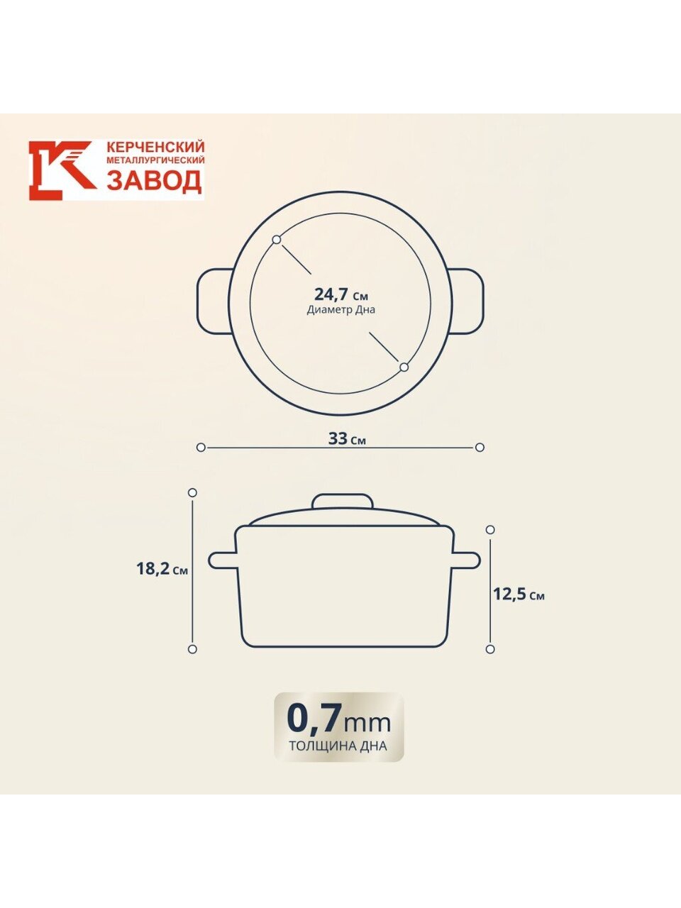 Объем — 4 литра, диаметр по крышке — 23 см, диаметр дна — 24,7 см, высота с крышкой — 18,2 см. Этого достаточно для приготовления на 3–5 человек.