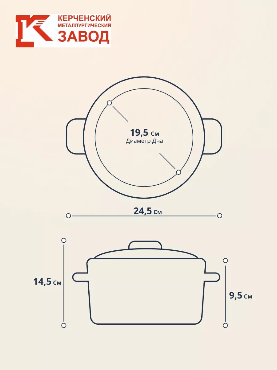 Диаметр дна — 19,5 см, диаметр крышки — 18 см, высота с крышкой — 14,5 см, без крышки — 9,5 см, вес — 1 кг.