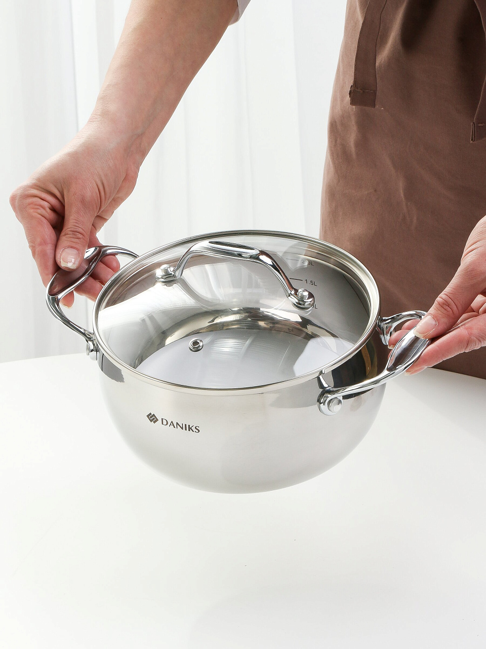 Кастрюля из нержавеющей стали Daniks Manola 2.3 л: идеальный выбор для индукции и любых плит, мерная шкала, стеклянная крышка, долговечность и комфорт.