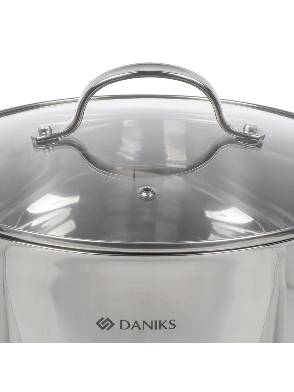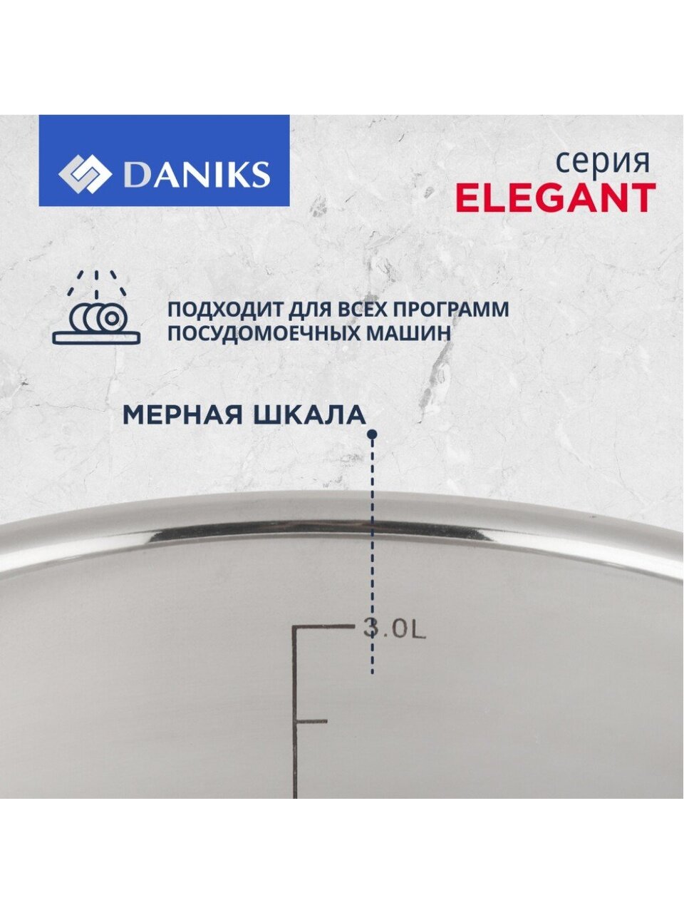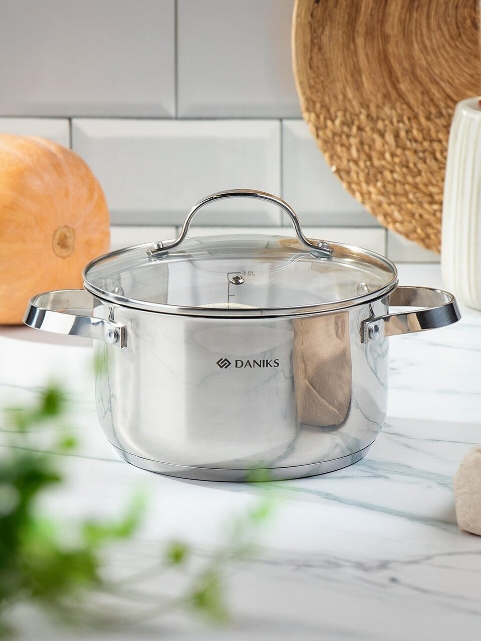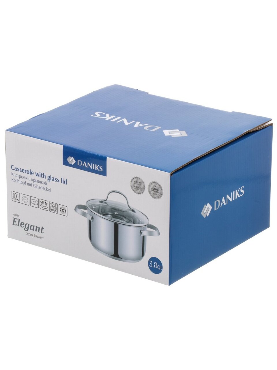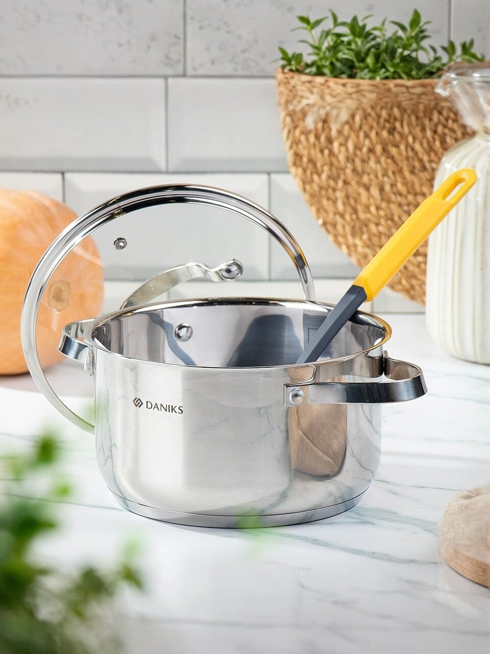 Кастрюля Daniks Элегант 3.6 л из нержавеющей стали с капсульным дном и стеклянной крышкой: идеальный выбор для индукции и всех типов плит, надежно и выгодно для дома и дачи.