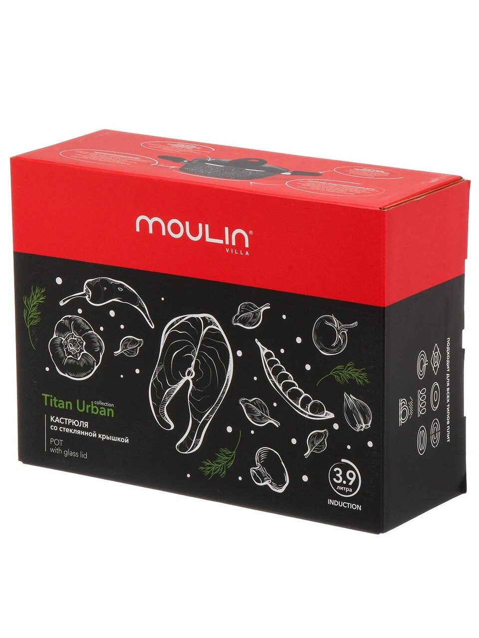 Кастрюля Moulin villa Titan Urban 3.9 л — универсальное решение для индукции и любых плит: антипригарное покрытие PFLUON, бакелитовые ручки, стеклянная крышка.