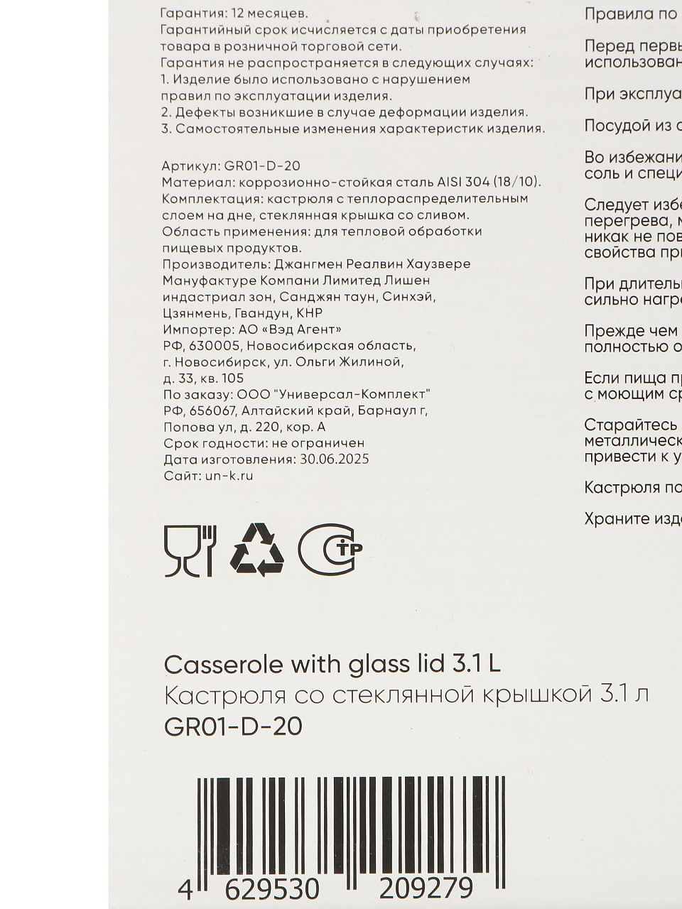 Вы можете приобрести «Кастрюля нержавеющая сталь, 3.1 л, крышка стекло, Катунь, Nord, GR01-D-20, индукция» и другие товары в нашем интернет-магазине в Борисоглебске по низким ценам и с бесплатным самовывозом.