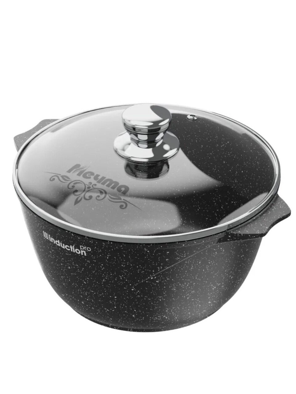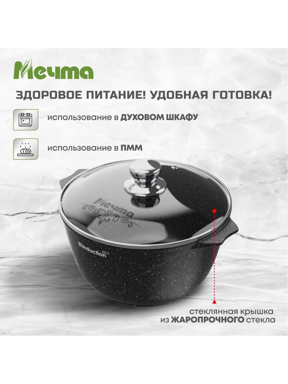 Кастрюля 5 л Мечта Гранит Black Induction Pro — антипригарная алюминиевая посуда с крышкой из закалённого стекла для индукционных и всех типов плит. Готовьте легко и без пригорания!