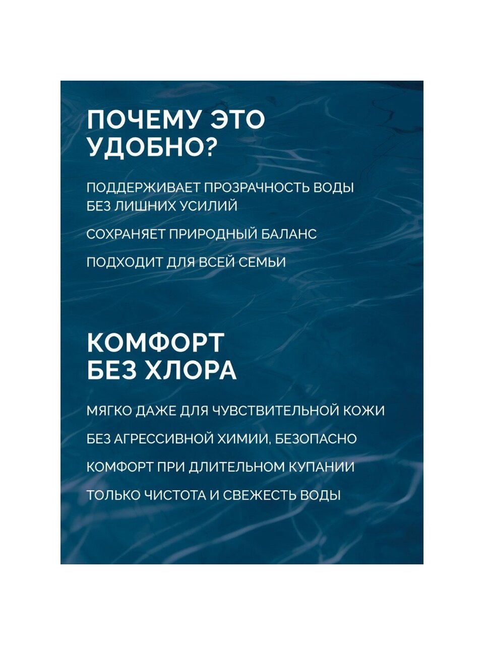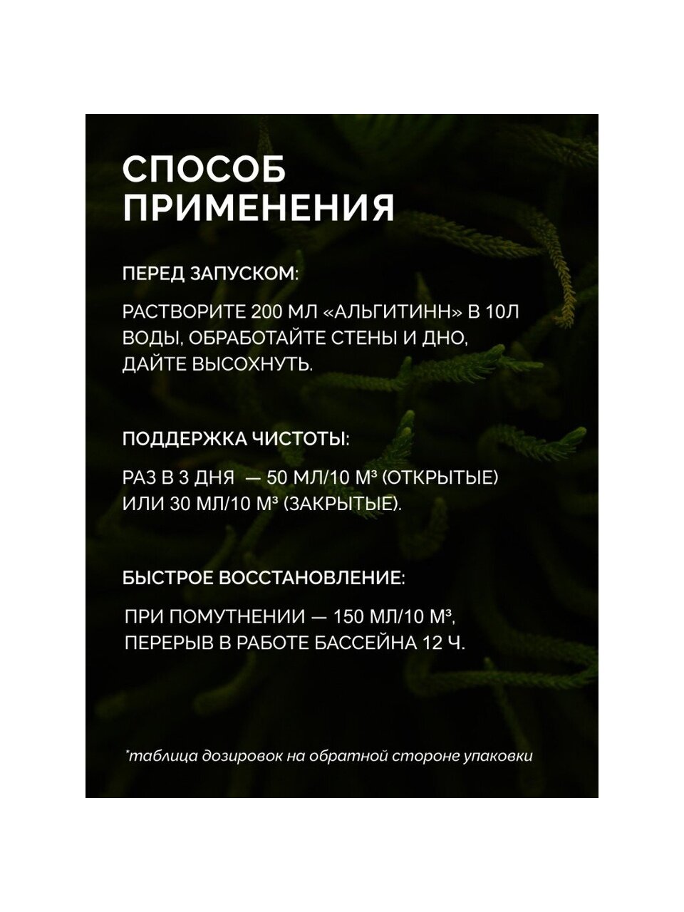 Средство "Альгитинн" идеально подходит для тех, кто ценит чистоту и безопасность. Его использование позволяет поддерживать идеальное состояние воды в бассейне, обеспечивая комфортное и безопасное купание для всей семьи. Благодаря отсутствию хлора и тяжелых металлов, продукт сохраняет природный баланс воды и не оказывает негативного влияния на кожу и здоровье.