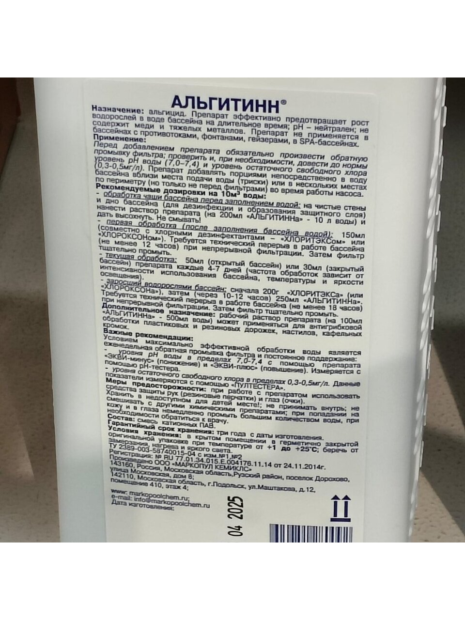 Создайте идеальные условия для вашего бассейна с помощью средства "Альгитинн" от Маркопул Кемиклс. Это высокоэффективное жидкое средство предназначено для борьбы с водорослями и поддержания чистоты воды. Забыть о зеленом налете и нежелательных водорослях теперь проще простого!