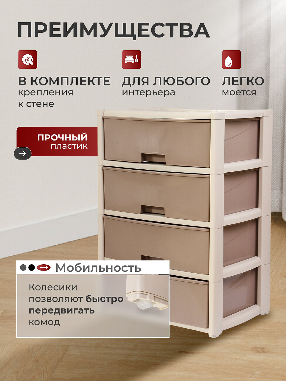 - Цельная конструкция перегородок обеспечивает прочность и долговечность комода.