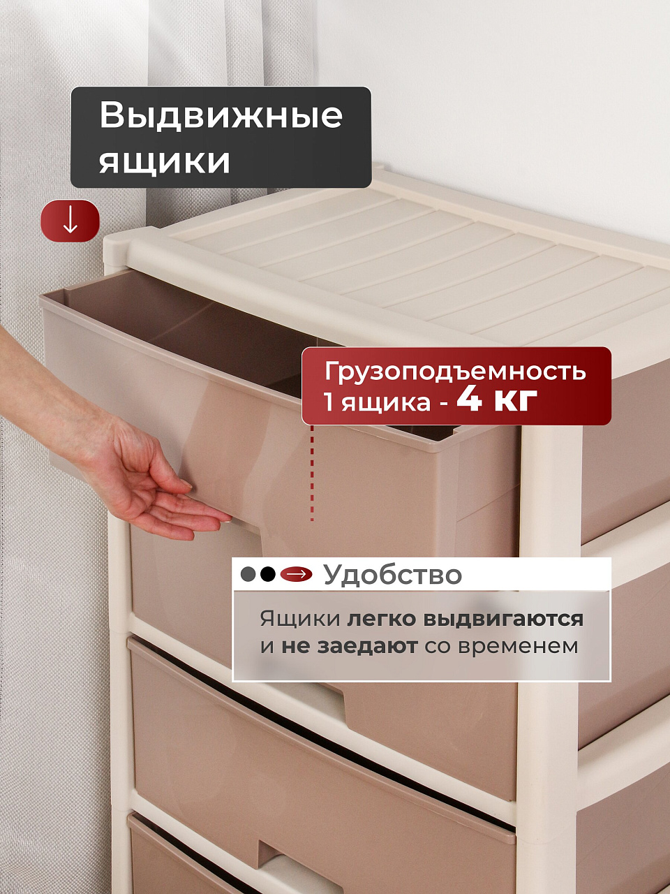 - Вместительные выдвижные ящики позволяют удобно организовать хранение вещей.