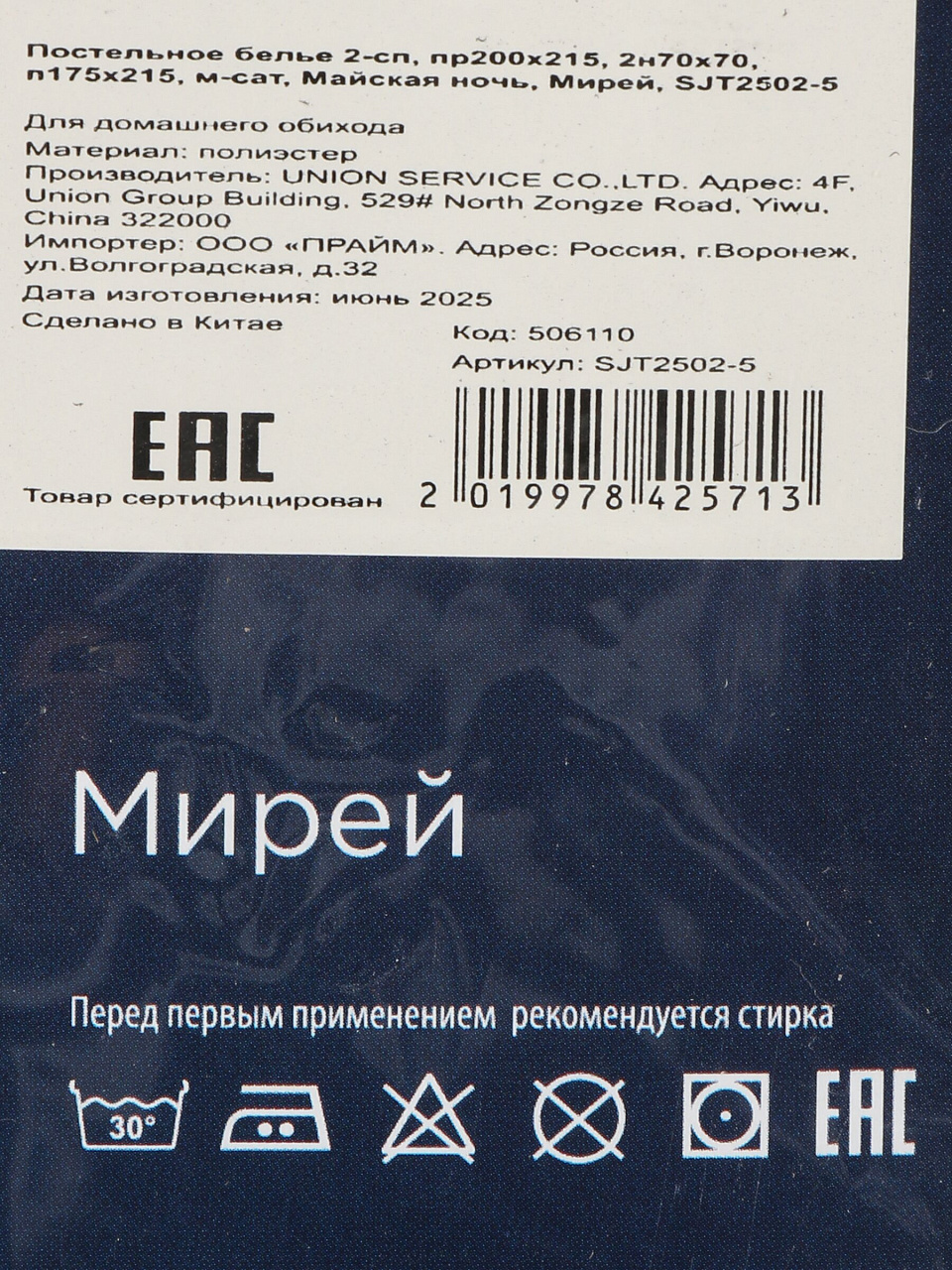 Постельное белье 2-сп, Майская ночь Мирей — это удачное решение для тех, кто ищет недорогой, но практичный комплект для двуспальной кровати. Микросатин на основе полиэстера обеспечивает приятные тактильные ощущения, не требует сложного ухода и сохраняет цвет после многократных стирок при 30 градусах. Благодаря молнии на пододеяльнике заправлять постель легко и быстро, что особенно важно для ежедневного использования.