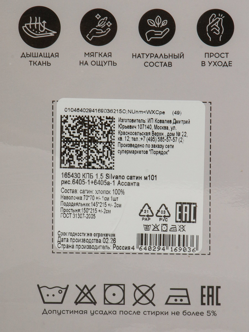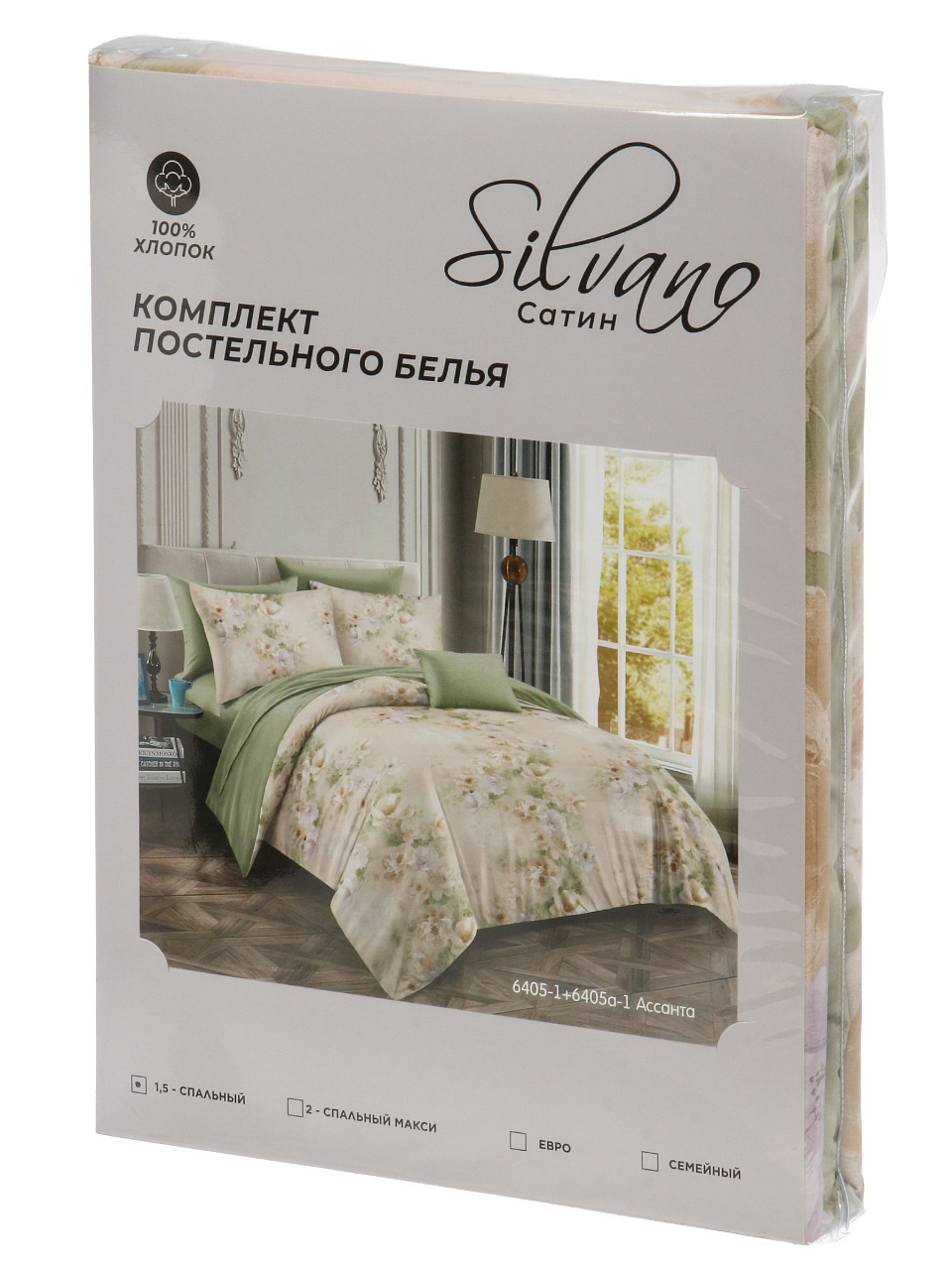 Постельное белье 1.5-спальное, простыня 150х215 см, 1 наволочка 70х70 см, пододеяльник 145х215 см, Silvano, сатин, Ассанта
