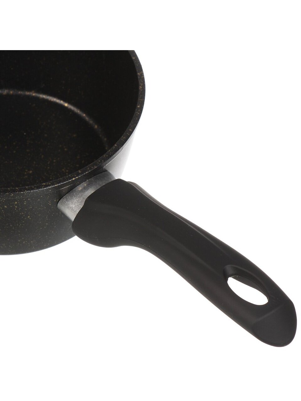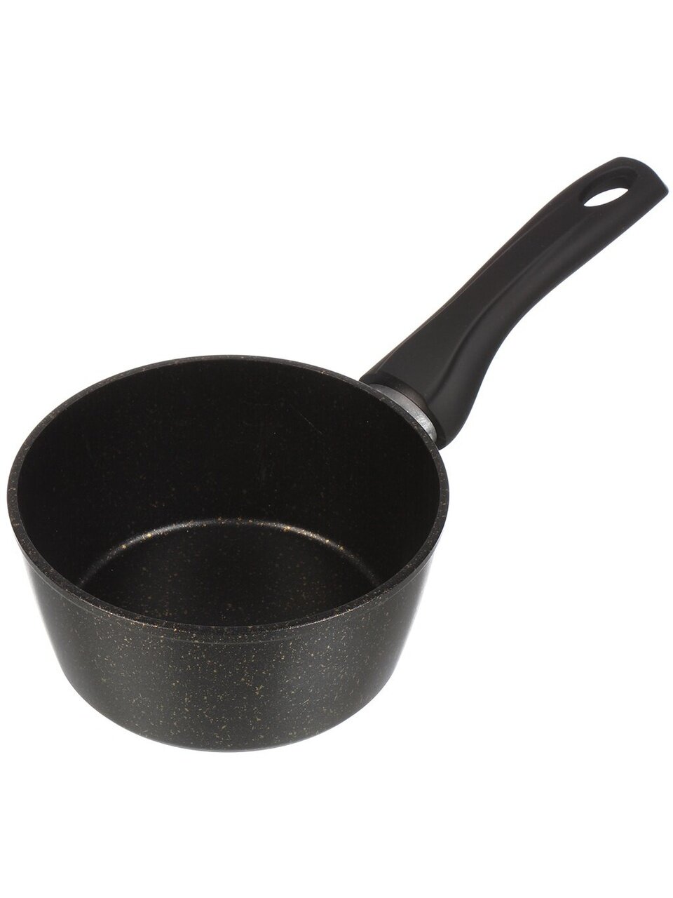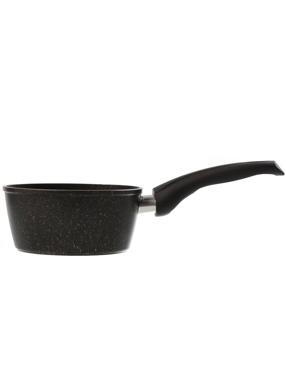 Ковш изготовлен из прочного алюминия, который обеспечивает равномерное распределение тепла, что способствует быстрому и качественному приготовлению пищи. Антипригарное покрытие позволяет готовить с минимальным количеством масла и легко очищается после использования, что делает процесс приготовления еще более приятным. Черный цвет ковша добавляет элегантности и стиля вашей кухне, а пластиковая ручка обеспечивает удобный и безопасный захват.