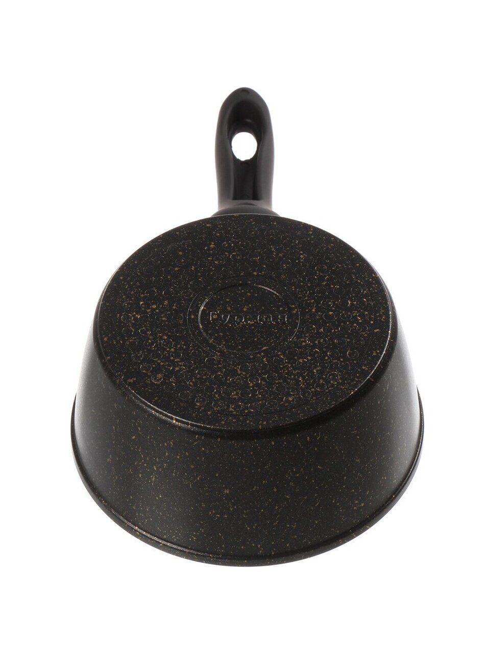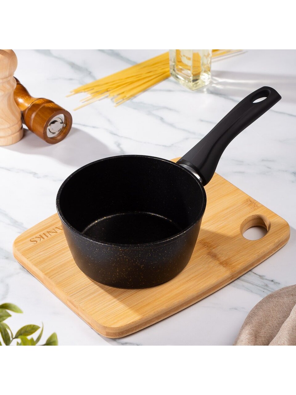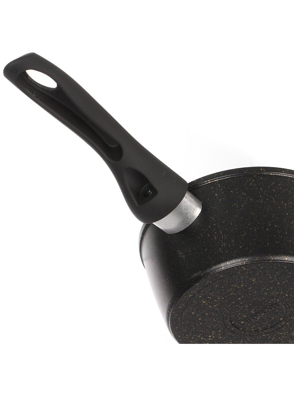 Ковш изготовлен из прочного алюминия, который обеспечивает равномерное распределение тепла, что способствует быстрому и качественному приготовлению пищи. Антипригарное покрытие позволяет готовить с минимальным количеством масла и легко очищается после использования, что делает процесс приготовления еще более приятным. Черный цвет ковша добавляет элегантности и стиля вашей кухне, а пластиковая ручка обеспечивает удобный и безопасный захват.