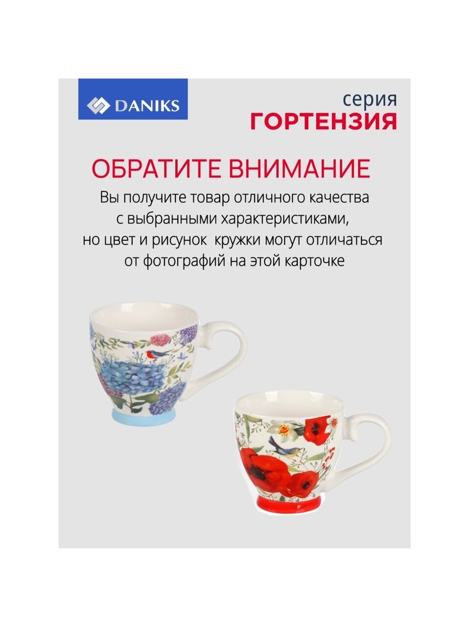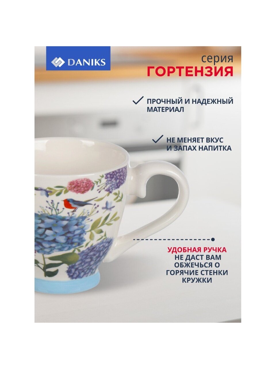 Многие спрашивают: «Как выбрать кружку для микроволновки?» или «Чем отличается керамика от стекла и металла?». Керамика лучше сохраняет температуру напитка, не нагревается снаружи так сильно, как стекло, и не придаёт постороннего вкуса, как металл. Кружка Daniks «Гортензия» подходит для использования в СВЧ, не имеет металлических элементов и легко вписывается в современный интерьер благодаря стильному рисунку цветов и птиц. По сравнению с аналогичными кружками, модель выделяется сбалансированным объёмом и универсальностью: подходит для дома, дачи, офиса, а также станет приятным подарком на каждый день.