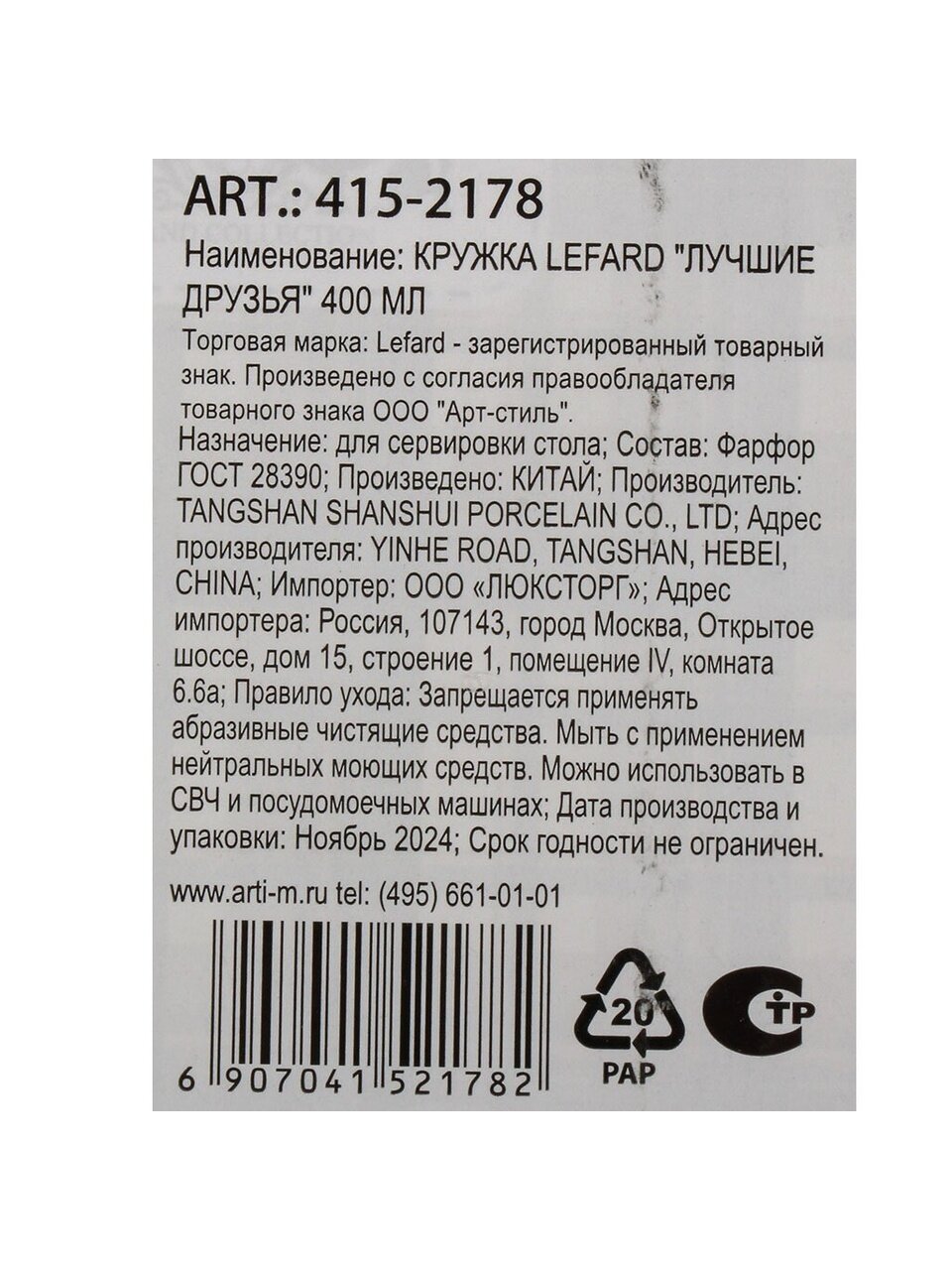 Вы можете приобрести «Кружка фарфор, 400 мл, Лучшие друзья, Lefard, 415-2178» и другие товары в нашем интернет-магазине в Нижнем Новгороде по низким ценам и с бесплатным самовывозом.
