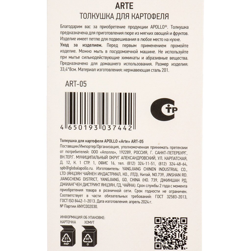 Толкушка для картофеля Apollo Arte — это современная картофелемялка из нержавеющей стали, которая обеспечивает быстрое и качественное приготовление пюре. Благодаря прочному материалу и цельной конструкции, изделие не деформируется даже при интенсивном использовании. Если вы ищете, какую толкушку выбрать для частого приготовления картофельного пюре, обратите внимание на модель ART-05: она устойчива к коррозии и легко очищается, что особенно важно для семей с детьми и любителей домашних блюд.