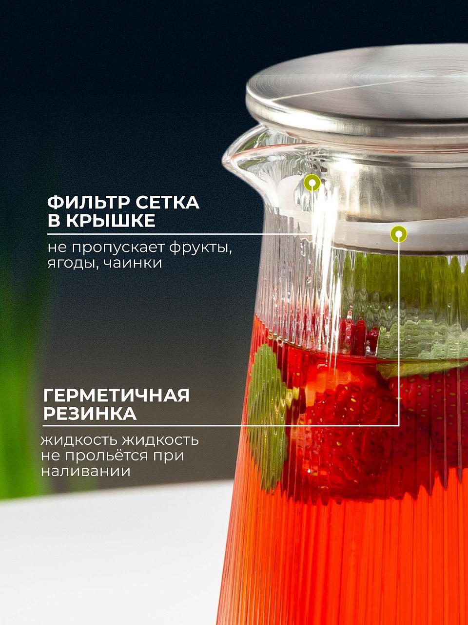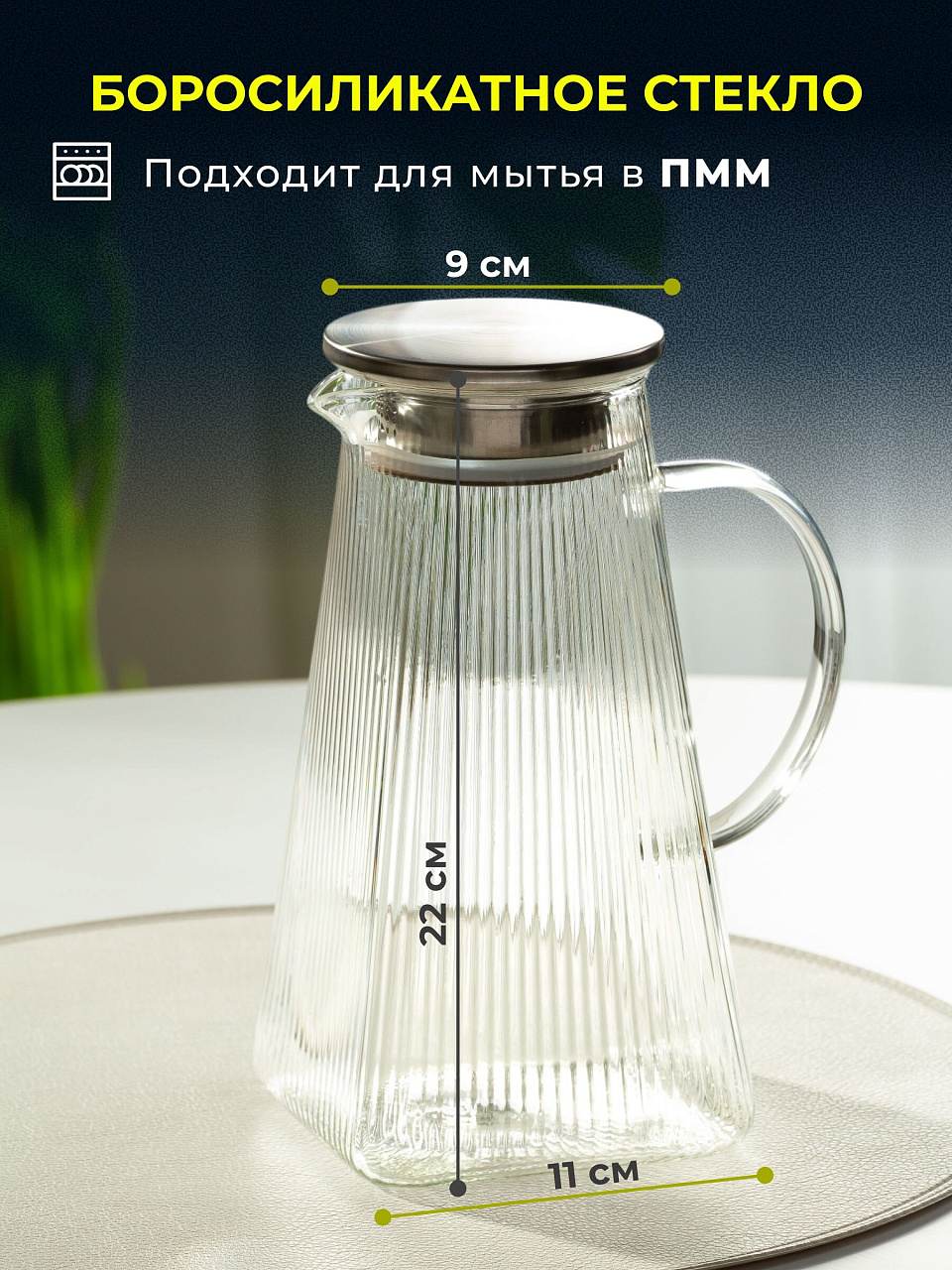 Изготовленный из боросиликатного стекла, кувшин сочетает в себе прочность и изящество. Этот материал известен своей устойчивостью к высоким температурам и механическим повреждениям, что делает его идеальным для использования в повседневной жизни. Объем 1.6 литра позволяет вместить достаточное количество напитка для всей семьи или компании друзей. Крышка, входящая в комплект, обеспечивает сохранение вкуса и аромата, предотвращая попадание посторонних запахов.