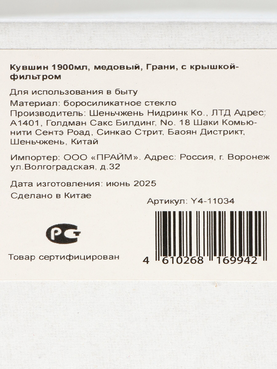 Кувшин боросиликатное стекло, 1.9 л, медов, Грани, крыш-фильтр, Y4-11034