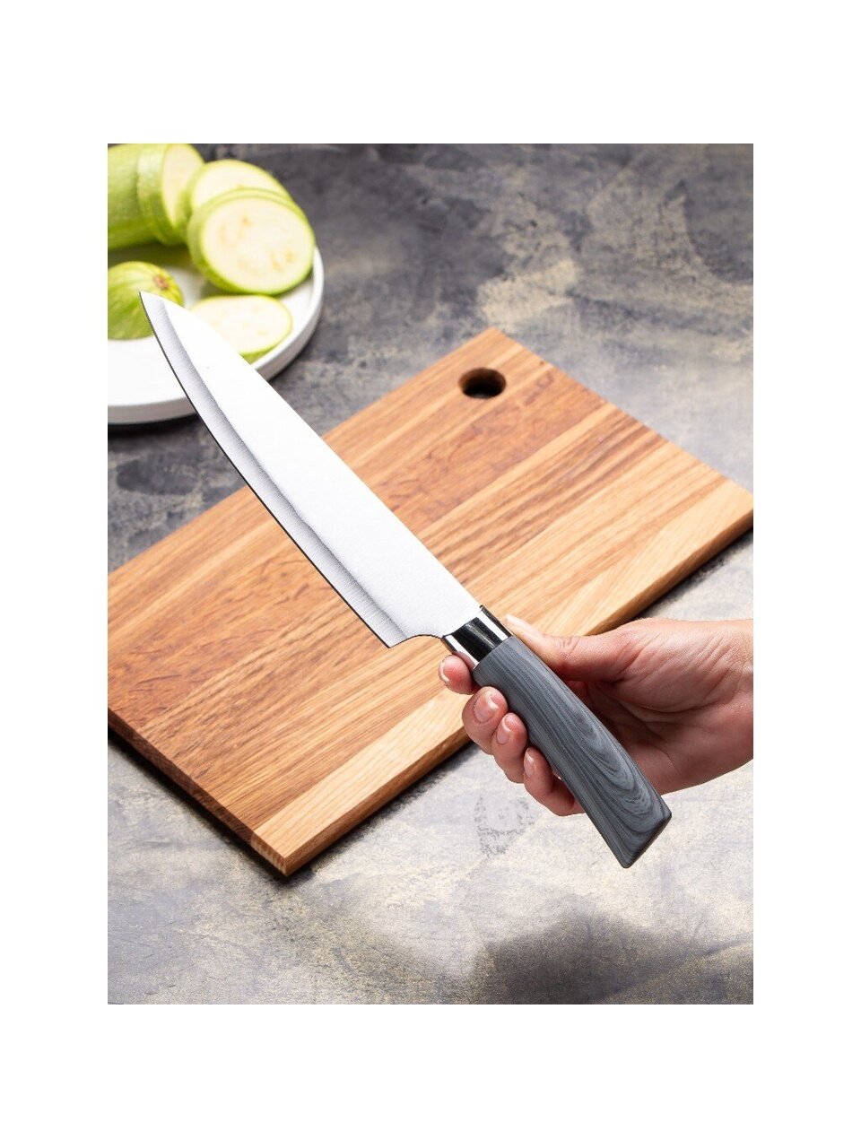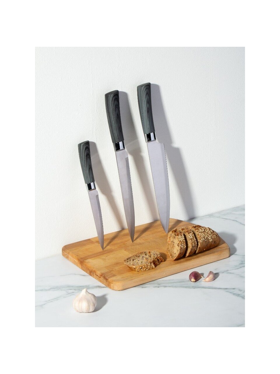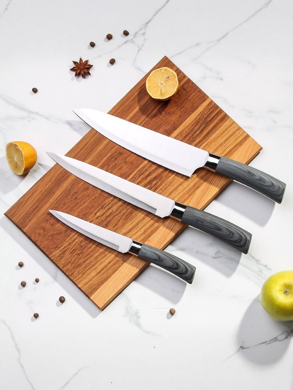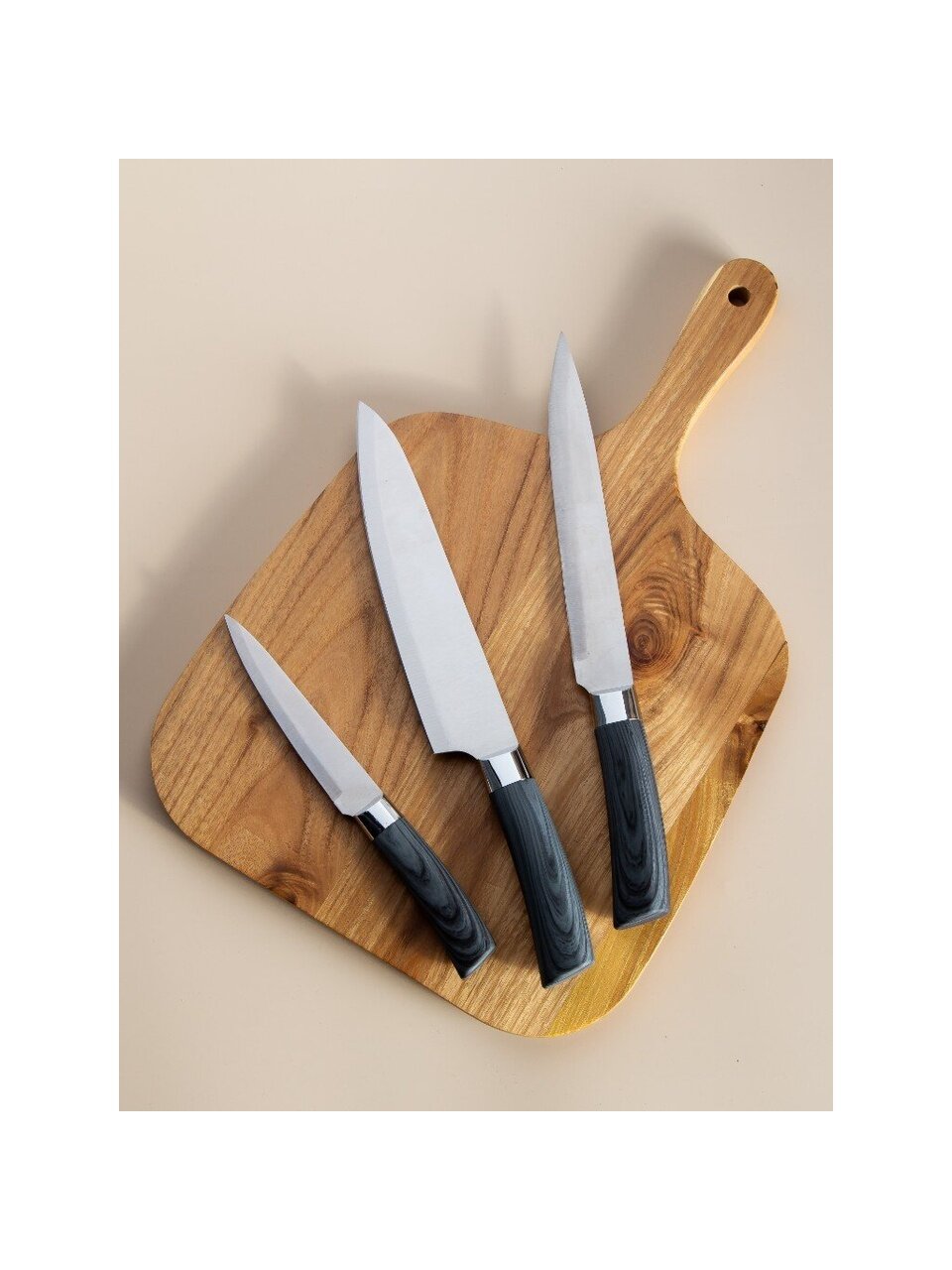 - универсальность: комплект включает шеф-нож, разделочный и универсальный нож;