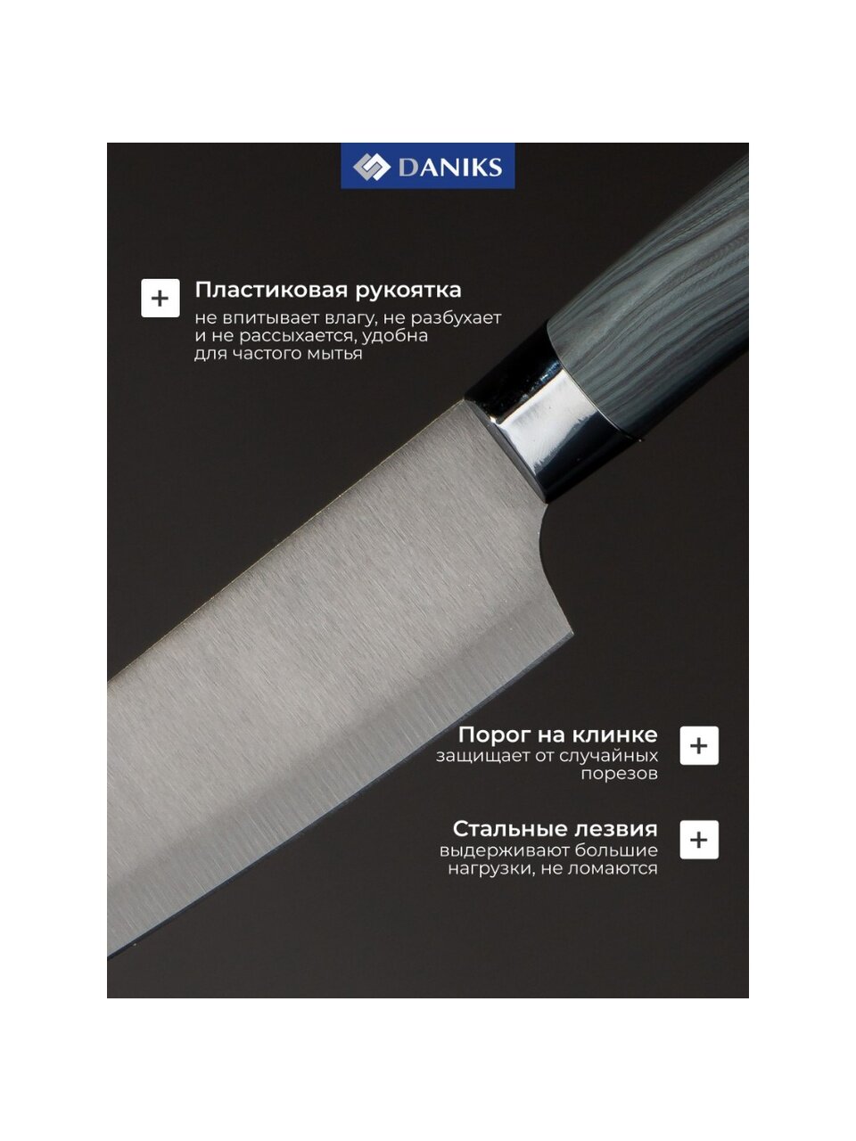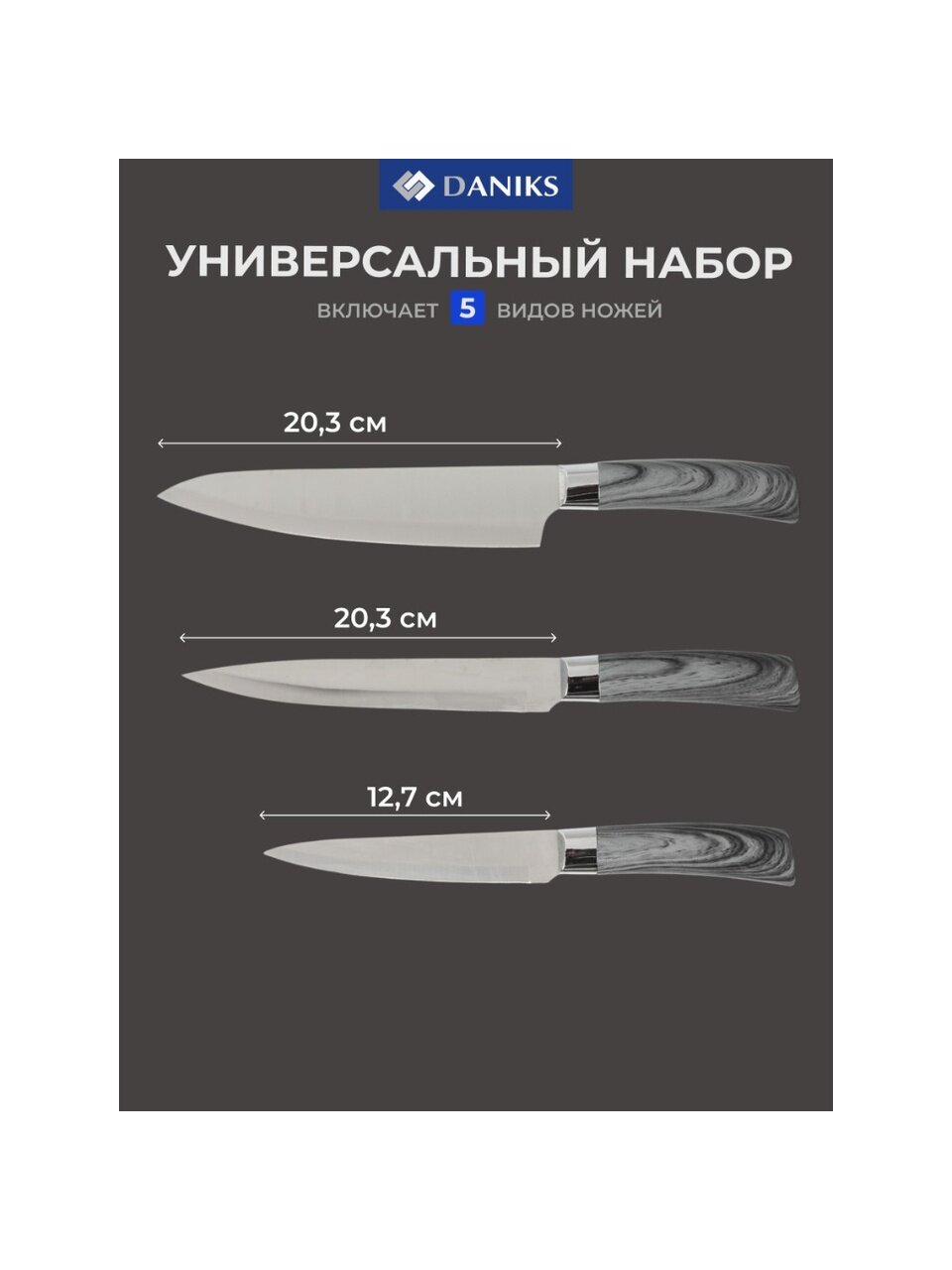 Покупка набора ножей Daniks Carbon — это выгодное вложение в комфорт и безопасность на кухне. Каждый нож из комплекта обеспечивает точную и быструю нарезку любых продуктов, от овощей до мяса, что позволяет готовить с удовольствием и без лишних усилий. Надежные материалы и продуманная конструкция гарантируют долговечность и простоту ухода, а стильный внешний вид радует глаз и подчеркивает индивидуальность кухни. Выбирая этот набор, легко получить идеальный баланс цены, качества и функциональности для дома или дачи.