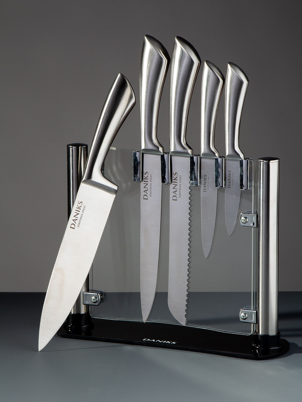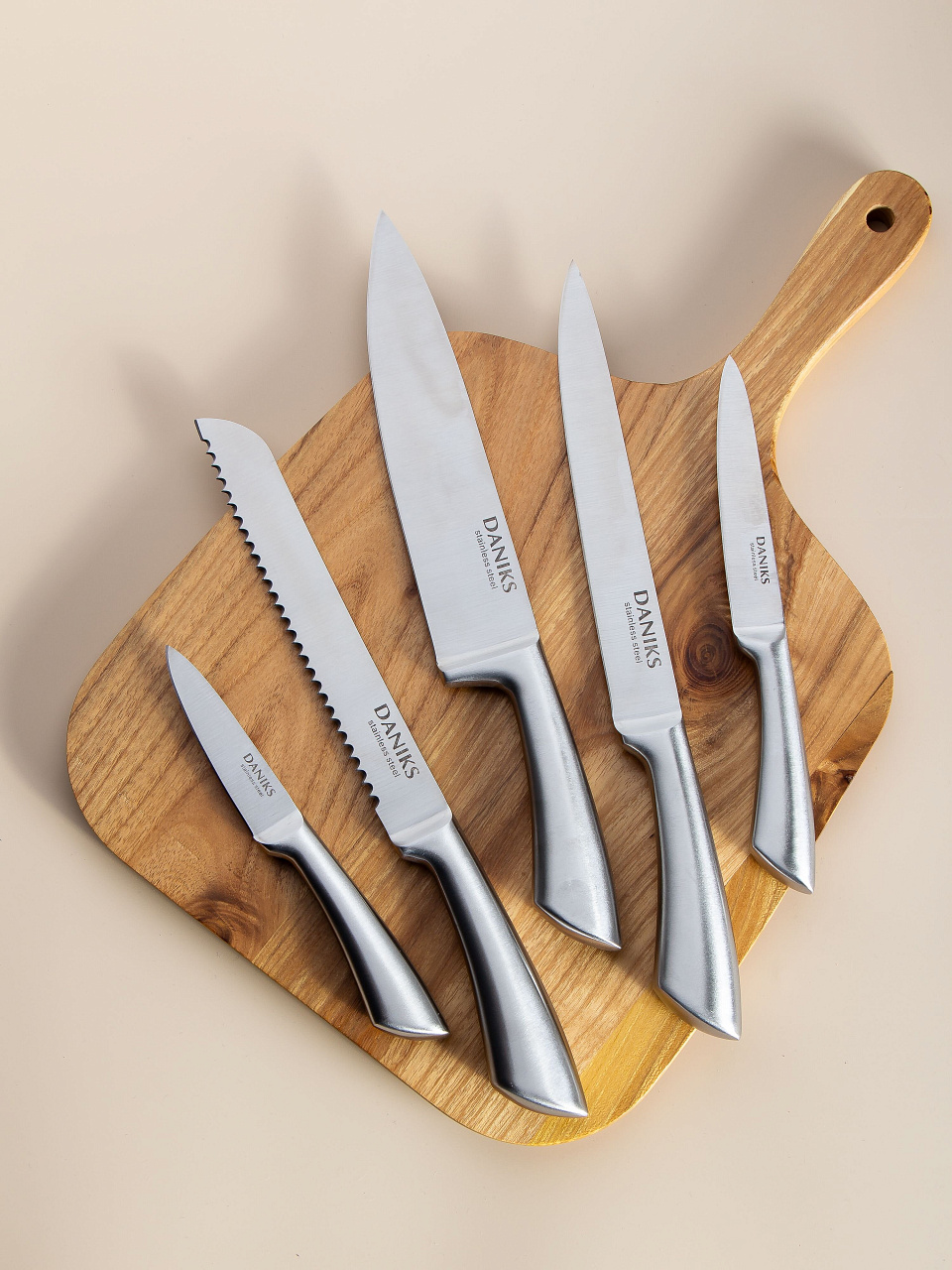 Набор ножей Daniks Урбан YW-A235N — идеальное решение для современной кухни, сочетающее стиль, функциональность и долговечность. Премиальный дизайн с цельнометаллическими рукоятками из нержавеющей стали и элегантной подставкой из акрила гармонично впишется в любой интерьер и подчеркнет вкус владельца. Высококачественная нержавеющая сталь обеспечивает долгий срок службы и острую заточку, что гарантирует легкость и точность резки любых продуктов. Серебристый цвет добавляет изысканности и современности, делая комплект не только практичным, но и стильным аксессуаром для кухни.