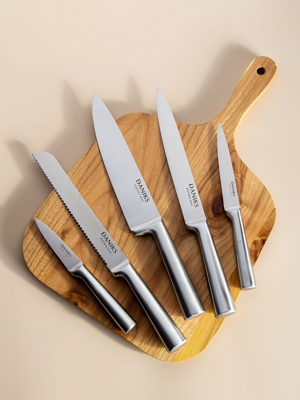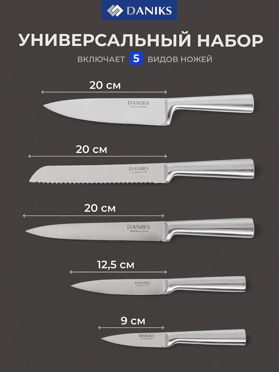 В комплекте предусмотрены шеф-нож, нож для овощей, универсальный нож, хлебный нож и разделочный нож. Благодаря разнообразию размеров – от 9 до 20 см – легко справляться с нарезкой любых продуктов: мяса, овощей, хлеба или фруктов. Эргономичная рукоятка из нержавеющей стали обеспечивает удобный и безопасный захват, а также легкость ухода. Подставка из металла поддерживает порядок на кухне и экономит место, что особенно важно для компактных пространств.