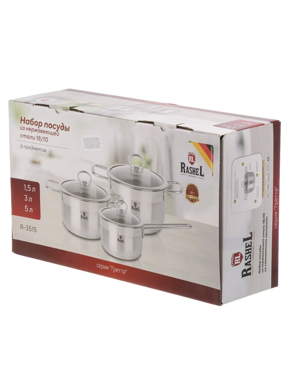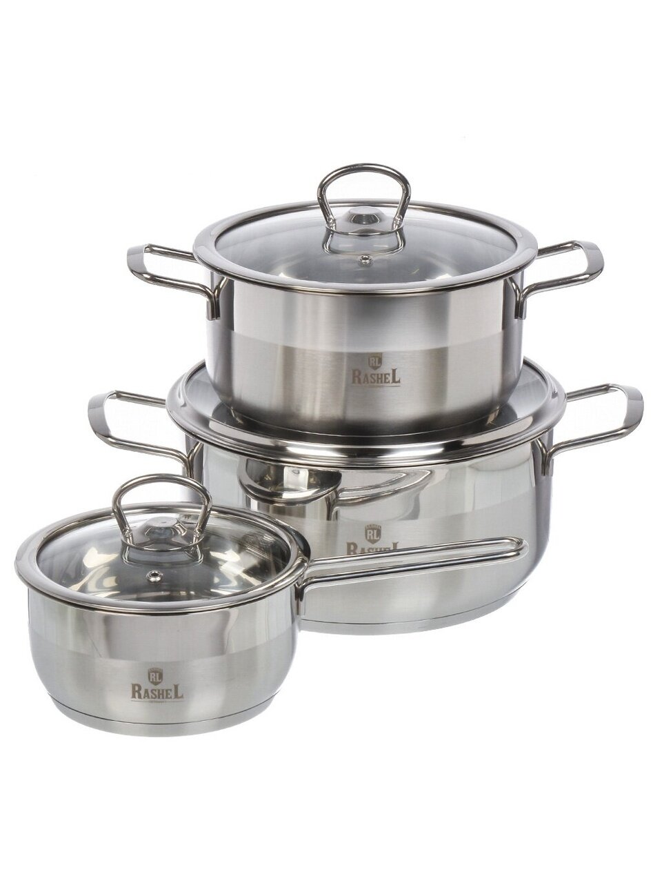 Набор посуды RasheL R-3515 из нержавеющей стали: 6 предметов для всех типов плит, объёмы 1.5/3/5 л, идеален для кухни, дачи и подарка.