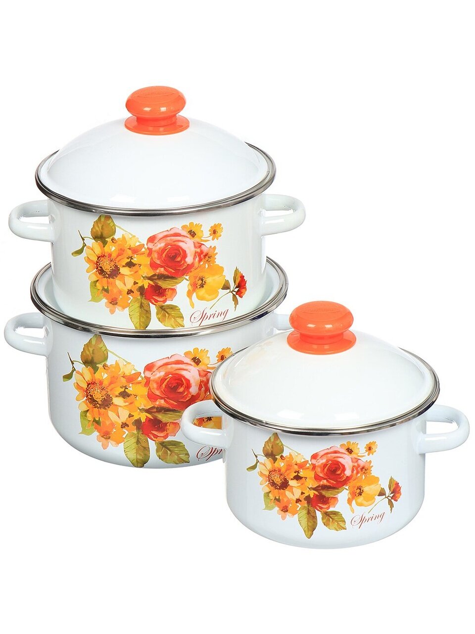 Набор эмалированной посуды 6 предметов «Весна 15» — универсальное решение для дома и дачи: 3 кастрюли (2, 3, 4 л), подходит для индукции, недорого и долговечно.