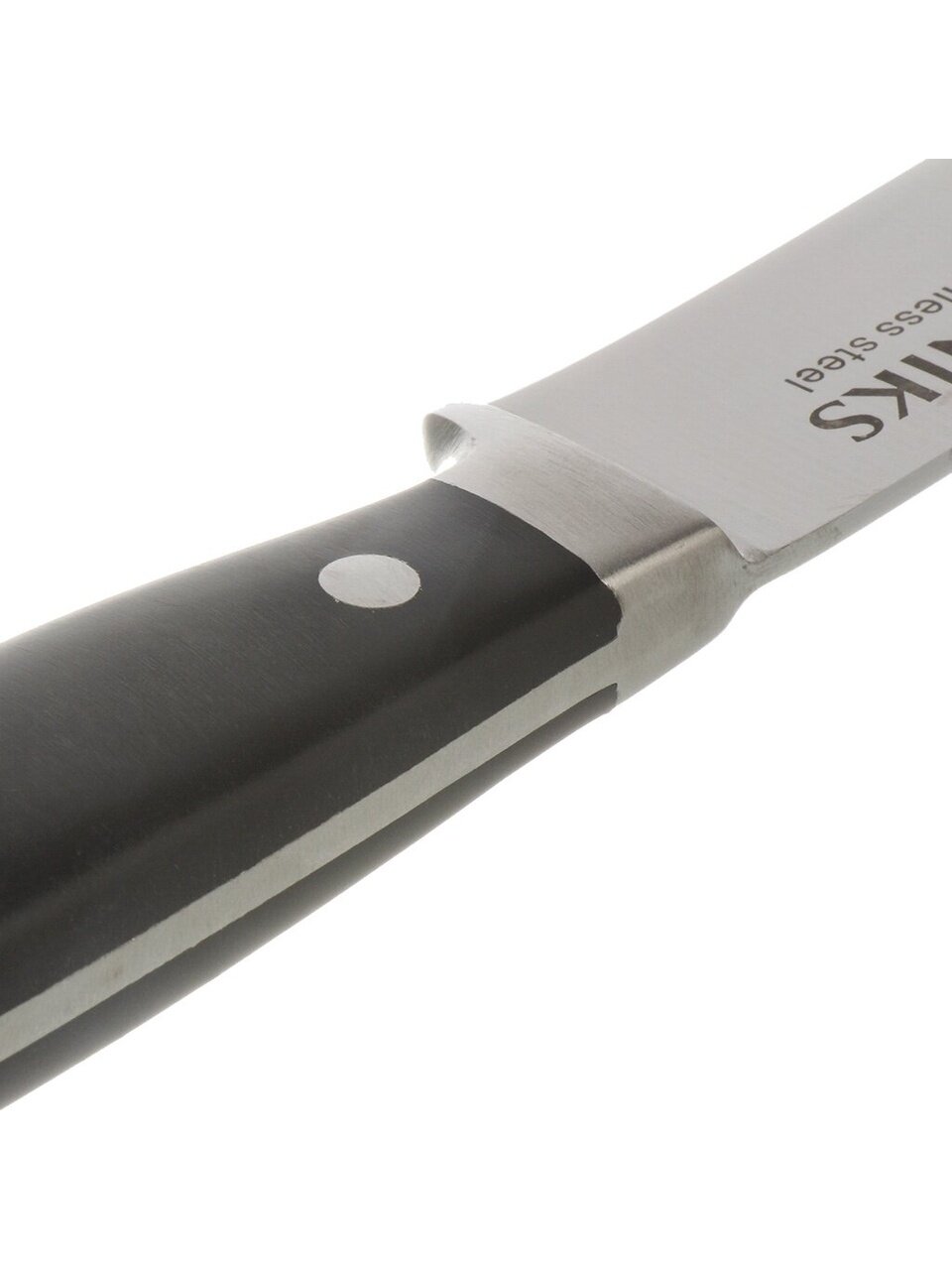 Рукоятка из пластика обеспечивает надежный хват и удобство в использовании. Она не скользит в руке, что особенно важно при работе с влажными продуктами. Цельнометаллическая конструкция ножа гарантирует его долговечность и устойчивость к повреждениям, что делает его идеальным выбором для ежедневного использования.