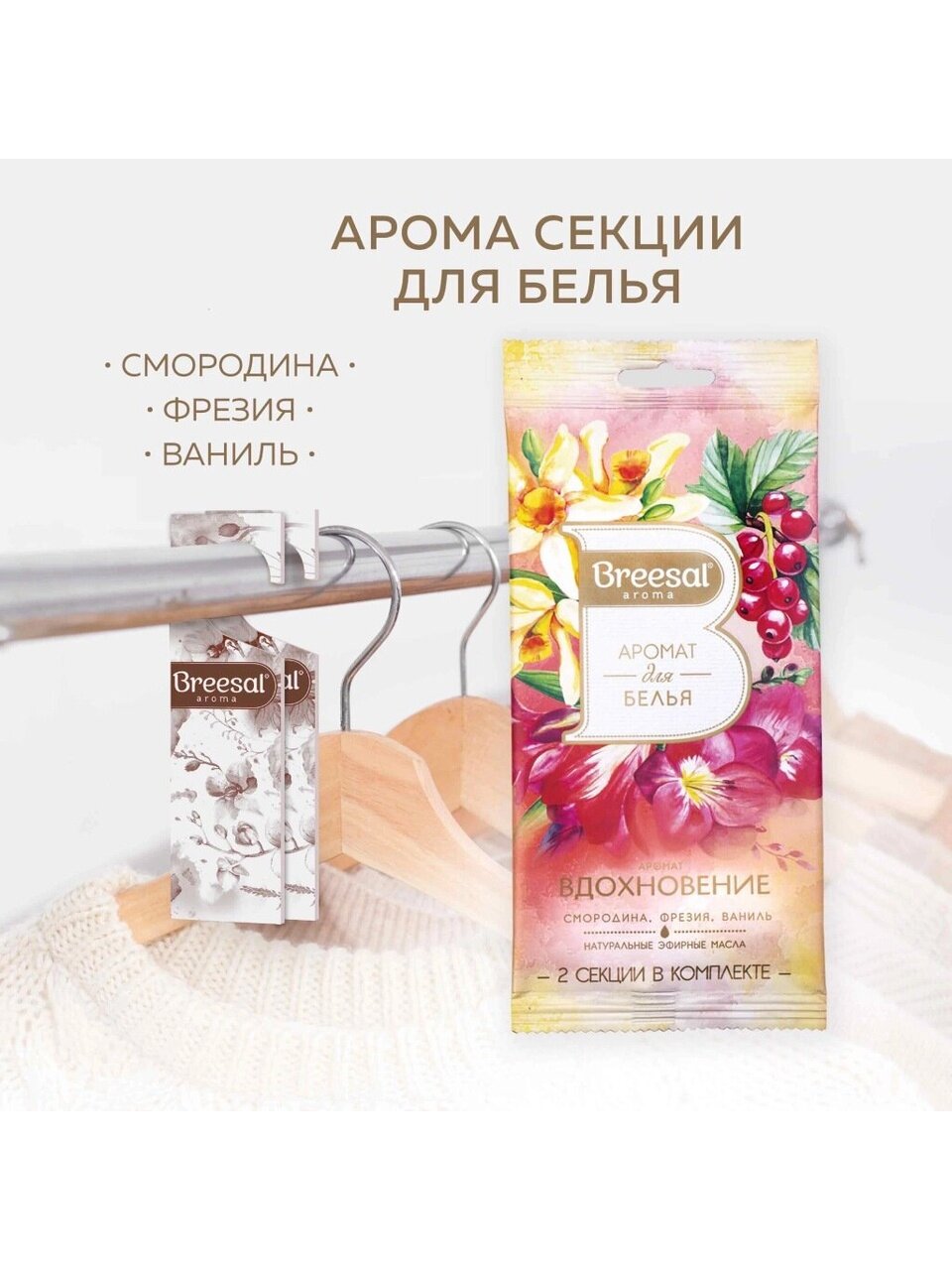 Секция ароматическая для гардероба – это чудесное решения для ароматизации вашего шкафа или гардеробной. Легкие, ненавязчивые и деликатные ароматы будут дарить вам прекрасное настроение каждый раз, когда вы открываете шкаф, гардеробную или надеваете любимую вещь. Сочный аромат свежей смородины, дополненный хлопковой фрезией и сладковатой ванилью, заключенный в этом ароматизаторе, непременно понравится вам.