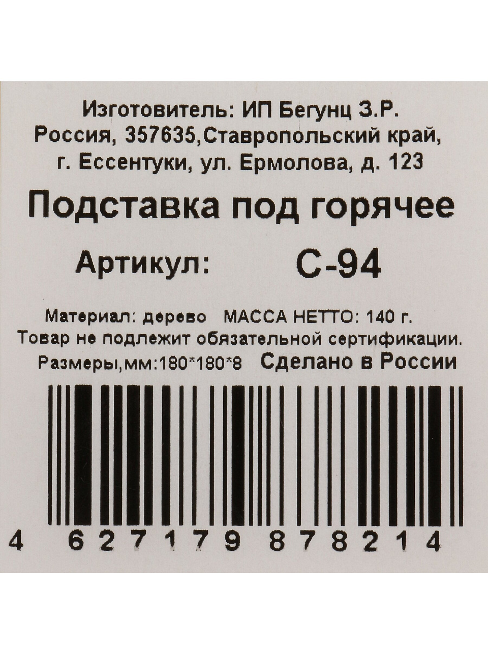 Подставка квадратная, 18×18 см, выполнена из натурального дерева, толщина 8 мм — оптимально для стандартной и крупной посуды.