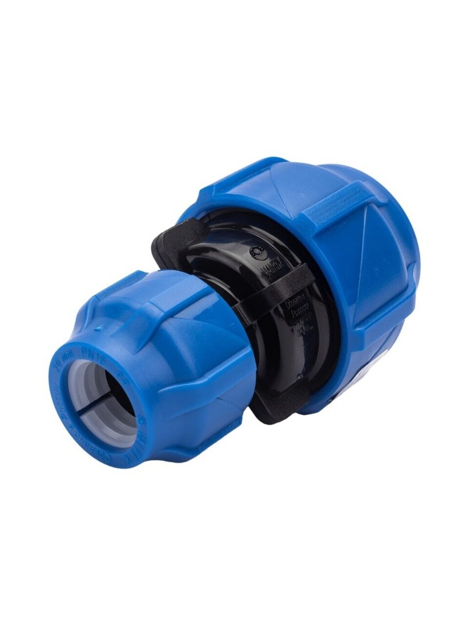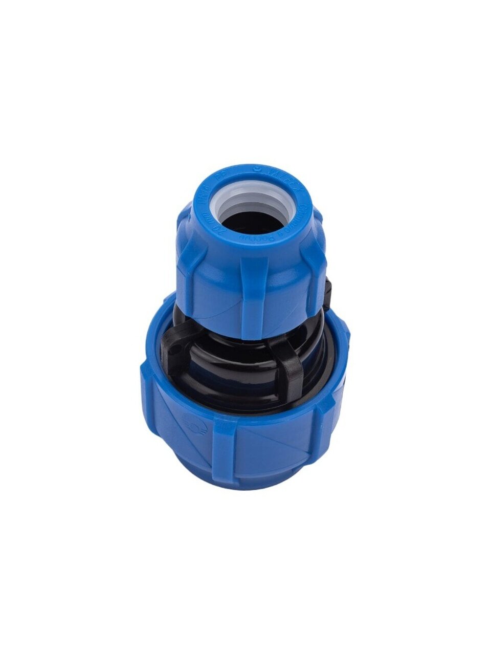 Компрессионная переходная муфта выполнена из полипропилена и применяется для соединения полиэтиленовых труб кольцевого сечения.