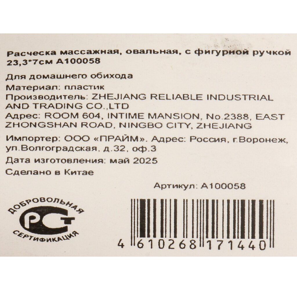 Расческа массажная, 23.3х7 см, овальная, с фигурной ручкой, A100058