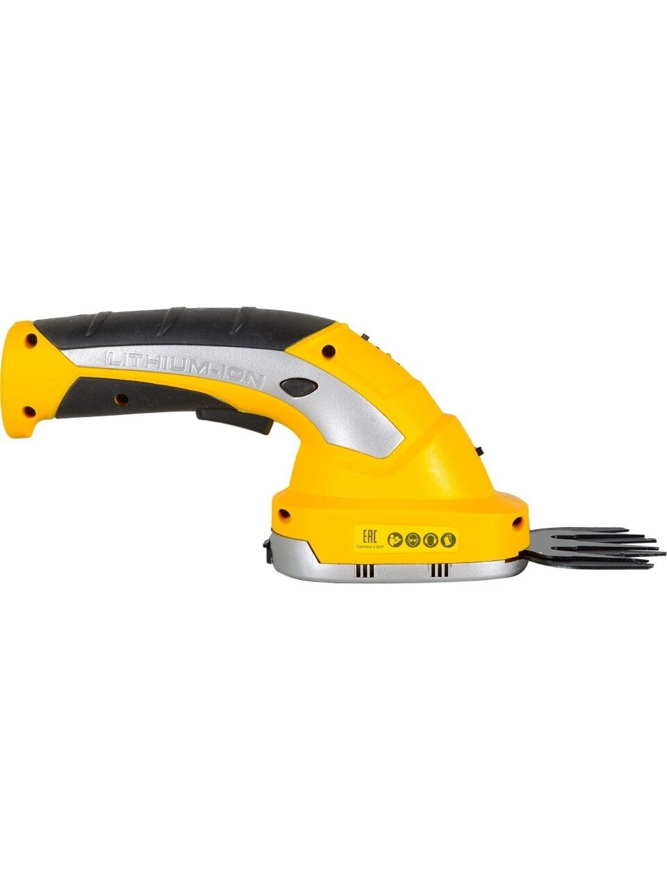 Корпус аккумуляторного кустореза выполнен в виде овальной платформы с наклонной эргономичной ручкой. Платформа снабжена крышкой с фиксатором, под которую прочно крепится необходимое для работы лезвие. Рукоятка с резиновыми накладками исключает проскальзывание руки во время работы.