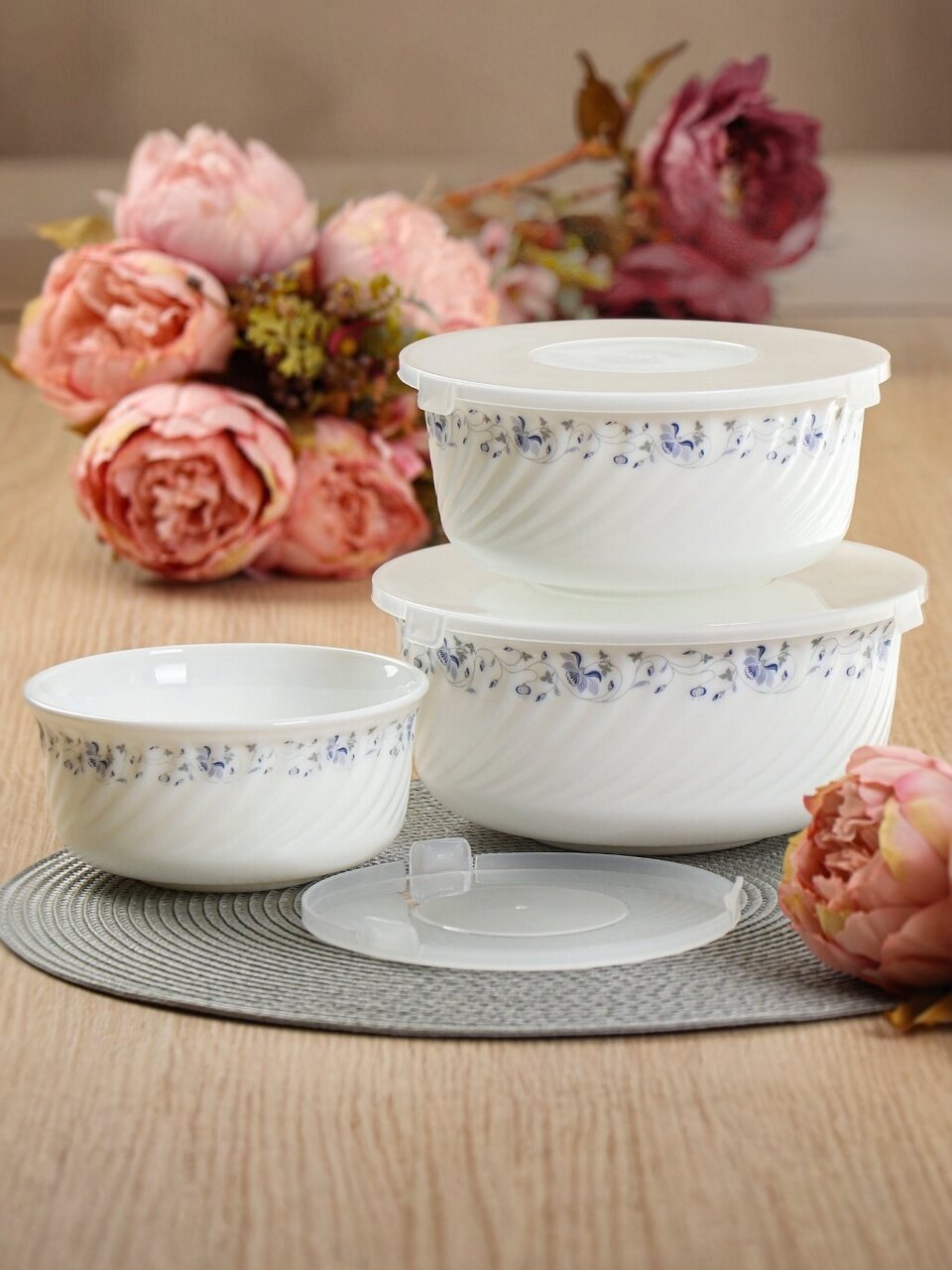 - Практичность: три размера (19, 16, 14 см), крышки в комплекте, подходят для СВЧ и посудомоечной машины