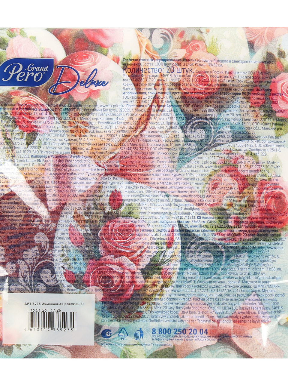 Вы можете приобрести «Салфетки Pero, Deluxe Изысканная роспись, 20 шт, 3 слоя, 33х33 см, 5235» и другие товары в нашем интернет-магазине в Брянске по низким ценам и с бесплатным самовывозом.