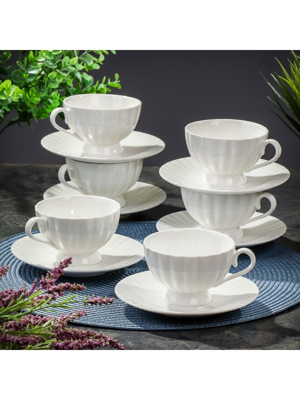 В наборе 12 предметов: 6 чашек объёмом 190 мл и 6 блюдец, рассчитан на 6 персон.