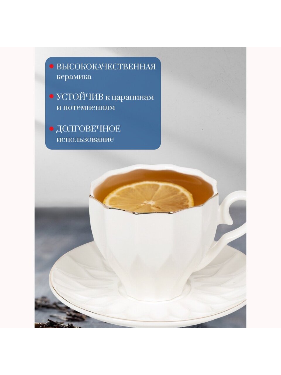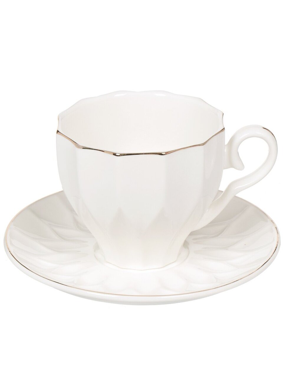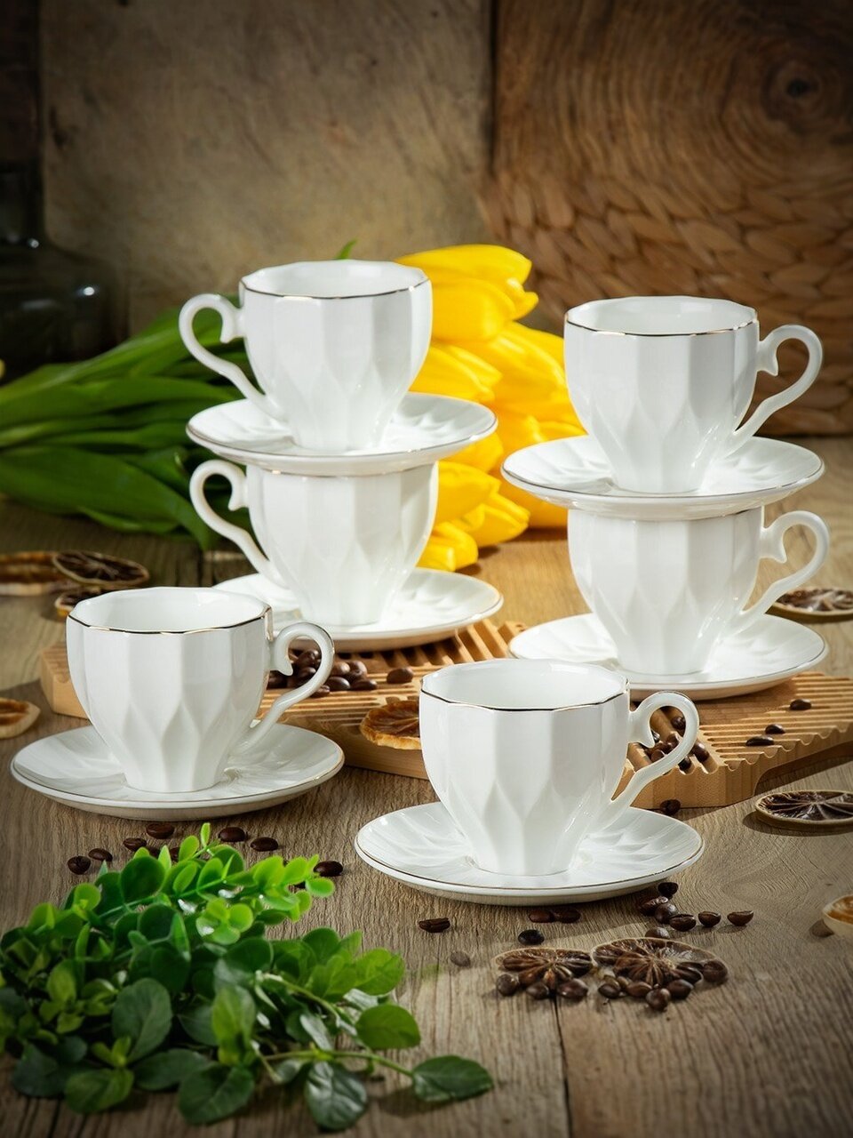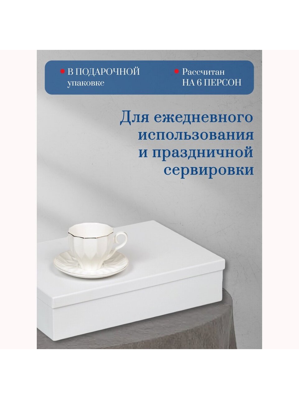 В наборе 12 предметов на 6 персон: шесть чашек по 180 мл и шесть блюдец, выполненных из керамики с золотой каймой.