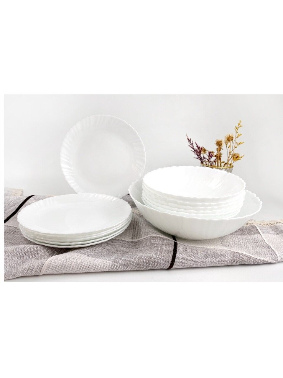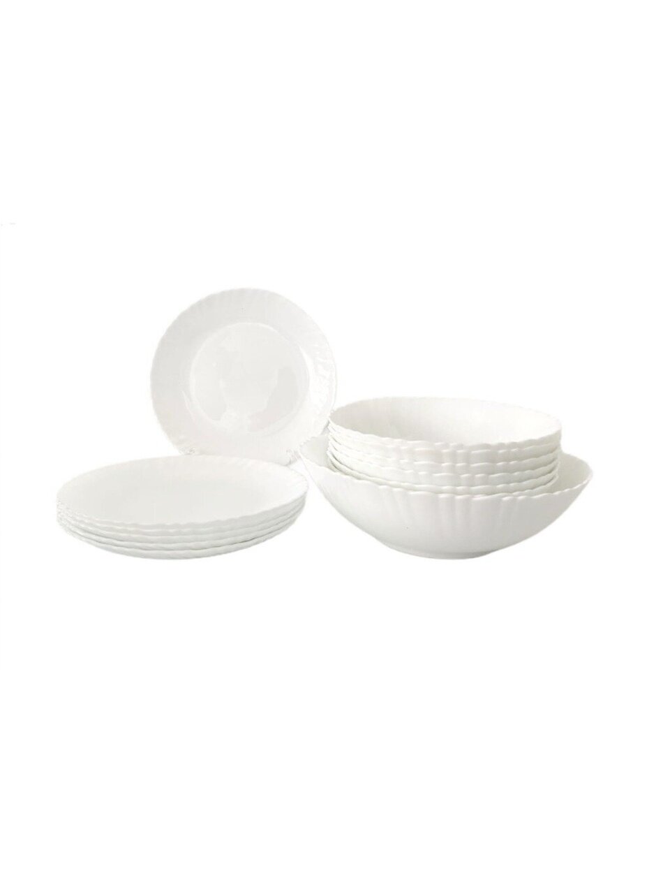 В наборе 13 предметов из прочной стеклокерамики; вес комплекта — 4 кг, цвет — белый, подходит для мытья в посудомоечной машине.